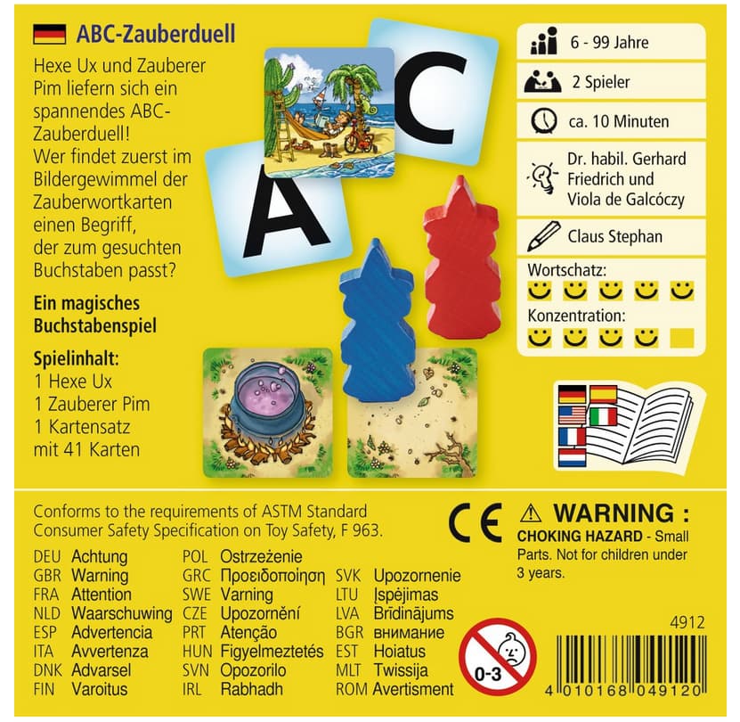 Im dunklen Zauberwald stehen sich Hexe Ux und Zauberer Pim in einem spannenden Wettstreit gegenüber: Welcher der beiden Magier kennt das mächtigste Zauberwort? Nur mit einer wimmeligen Zauberwortkarte, einer Buchstabenkarte und Spaß am Wörtersuchen kann es gefunden werden. Um in diesem kniffeligen ABC-Duell zu siegen, müssen die Spieler schnell ein Zauberwort finden. Dafür decken sie eine Buchstabenkarte und eine Zauberwortkarte auf. Jetzt suchen alle gleichzeitig auf dem Wimmelbild der Zauberwortkarte einen Begriff, der mit dem aufgedeckten Buchstaben beginnt. Wer glänzt mit einem guten Blick und schneller Reaktion? Denn nur so gewinnt ein Spieler das ABC-Zauberduell zwischen Hexe Ux und Zauberer Pim.Inhalt: 1 Hexe Ux (rot), 1 Zauberer Pim (blau), 10 Zauberwortkarten, 26 Buchstabenkarten, 3 Blankokarten zum Beschriften, 4 Wegkarten, 1 Zielkarte, 1 Spielanleitung.Autoren: Dr. Gerhard Friedrich GalgóczyViola de GalgóczyIllustratoren: Claus StephanSpielart: LernspielKonzentrationsspielWarnhinweise: Achtung. Nicht für Kinder unter 3 Jahren geeignet. Kleine Teile. Erstickungsgefahr.Sprache der Spielanleitung: DeutschEnglischFranzösischNiederländischSpanischItalienischAlter bis: 99 JahreAlter von: 6 JahreSpieleranzahl bis: 4 Person(en)Spieldauer von: 5 Min.Spieleranzahl von: 2 Person(en)Spieldauer bis: 10 Min.Material: Pappe, Holz