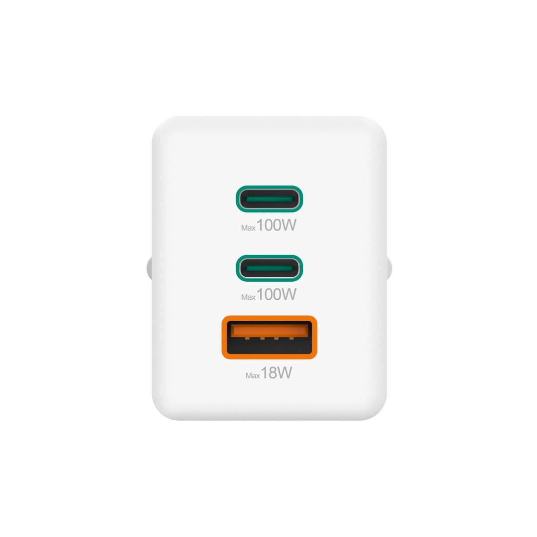 Der integrierte Lade-IC passt die Belegung des USB-Anschlusses an das angeschlossene Gerät an. Dadurch können Geräte aller Marken mit maximaler Geschwindigkeit geladen werden. Das Gerät liefert eine Gesamtladeleistung von 100 W, jeder USB-C-Port liefert eine Ladeleistung von max. 100 W, der USB-A-Port liefert eine Ladeleistung von max. 18 Watt. Werden mehrere Geräte gleichzeitig angeschlossen, teilt sich die Ladeleistung entsprechend auf.