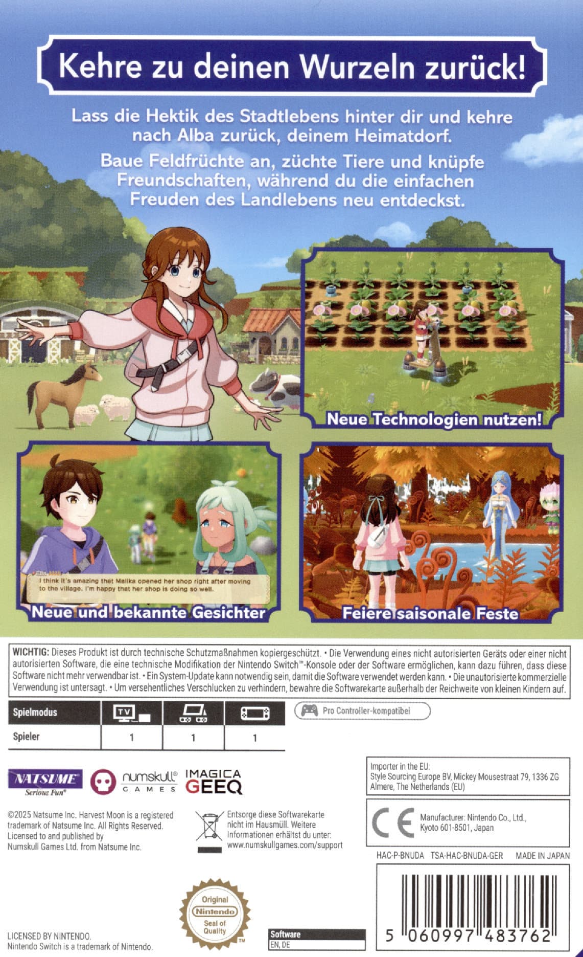 Bist du bereit für die Herausforderung? Harvest Moon - Home Sweet Home lädt dich ein, den Trubel des Stadtlebens hinter dir zu lassen und den Charme und die Einfachheit des Dorfes Alba – deiner Kindheitsheimat – zu genießen. Eingebettet in üppiges Grün und funkelnde Flüsse ist Alba bekannt für seinen frisch gefangenen Fisch, köstliches selbst angebautes Gemüse und eine warmherzige Gemeinschaft. Doch Alba hat bessere Zeiten gesehen. Mit einer schrumpfenden Bevölkerung und einer alternden Gemeinschaft braucht das Dorf einen Neuanfang. Es liegt an dir, Alba neues Leben einzuhauchen und es wieder zu einem florierenden, einladenden Ort zu machen. Knüpfe alte Freundschaften neu, triff neue Gesichter und hilf dabei, dieses ruhige Dorf in eine lebendige Oase für Touristen und zukünftige Bewohner zu verwandeln! Baue bedeutungsvolle Beziehungen auf Triff eine Reihe liebenswerter Junggesellen und Junggesellinnen – darunter zwei Fanlieblinge, Ella und Nikolai aus Harvest Moon: The Winds of Anthos! Verliebe dich und heirate, wen dein Herz begehrt. Vertiefe Freundschaften durch tägliche Interaktionen, durchdachte Geschenke und erzählerische Herzensereignisse, die mehr über das Leben und die Träume jedes Charakters enthüllen. Baue, fische und schmiede ein neues Leben Baue eine Vielzahl saisonaler Feldfrüchte an, kümmere dich um niedliche Tiere wie Kühe, Hühner und Schafe und schalte Upgrades frei, um deine Farm zu erweitern. Fische in ruhigen Flüssen, erkunde versteckte Höhlen, um seltene Erze abzubauen, und erfülle Aufträge von Dorfbewohnern, um Belohnungen zu erhalten und deinen Ruf zu verbessern. Lass Alba mit Glück wachsen Sammle und verbreite Glück, eine einzigartige Ressource, die deinen positiven Einfluss auf das Dorf widerspiegelt. Je mehr Glück du sammelst, desto mehr verwandelt sich Alba – neue Gebäude, Geschäfte, Spezialevents werden freigeschaltet und sogar alte Bewohner werden ermutigt zurückzukehren oder neue ziehen ein. Feiere die Gemeinschaft Nimm an spannenden saisonalen Festen, lustigen Wettbewerben und lokalen Traditionen teil, die Albas einzigartige Kultur zeigen. Pferderennen, Angelturniere, Blumenfeste und mehr warten auf dich – jedes mit Minispielen, Preisen und tieferen Verbindungen zur Gemeinschaft. Erkunde schneller als je zuvor Saus durch die Stadt mit Doc Jrs Hoverbike 5000, einem praktischen Hover-Scooter, perfekt um tägliche Aufgaben zu erledigen, Lieferungen zu machen oder einfach die malerische Schönheit Albas zu genießen. Reise schneller, erledige mehr und genieße ein neues Maß an Komfort!
