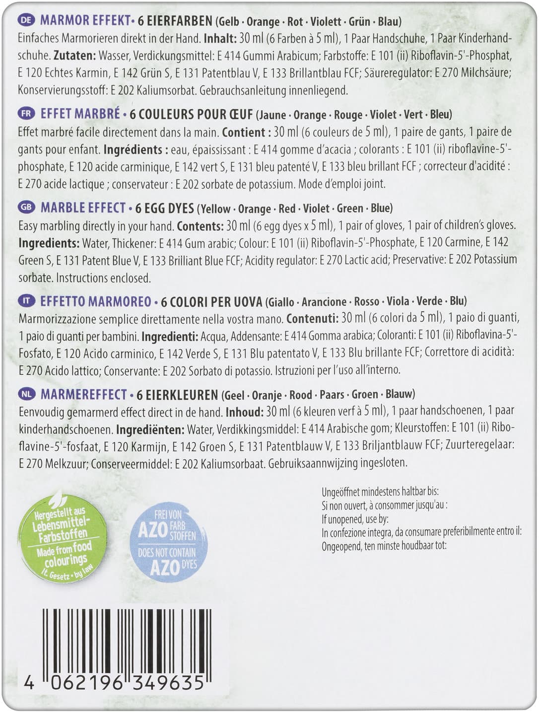 Mit dem HEITMANN Marmor Effekt zauberst du edel schimmernde Ostereier mit faszinierender Marmorierung – ganz einfach und ohne großen Aufwand. Die besonderen Farbpigmente erzeugen einzigartige Strukturen, die jedes Ei zu einem echten Unikat machen. Perfekt für alle, die ihren Ostereiern einen stilvollen, hochwertigen Look verleihen möchten. Die Anwendung ist unkompliziert: Farbe anmischen, Eier eintauchen, trocknen lassen und bei Bedarf leicht nachpolieren. So entstehen im Handumdrehen wunderschöne marmorierte Effekte in intensiven, kräftigen Farben.
