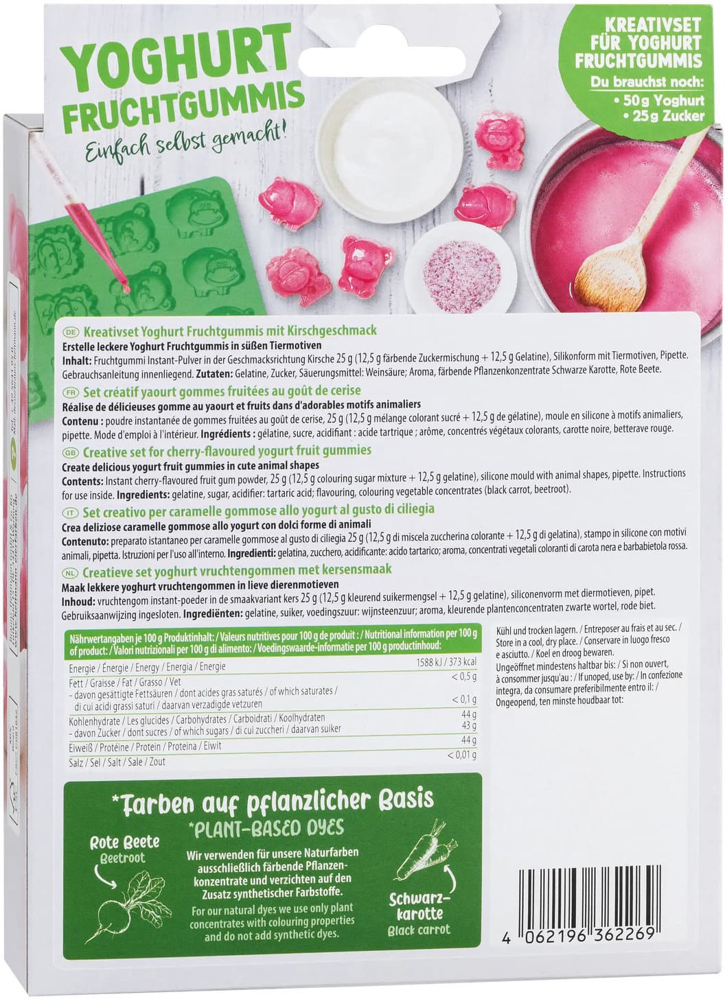Mit HEITMANN KREATIV Joghurt Fruchtgummis Safari Mix zauberst du tierisch leckere Fruchtgummis ganz einfach selbst. Mit fruchtigem Kirschgeschmack, Farben zu 100% aus der Natur und niedlichen Safari-Motiven wird das Selbermachen zum süßen Highlight für kleine und große Naschfans.