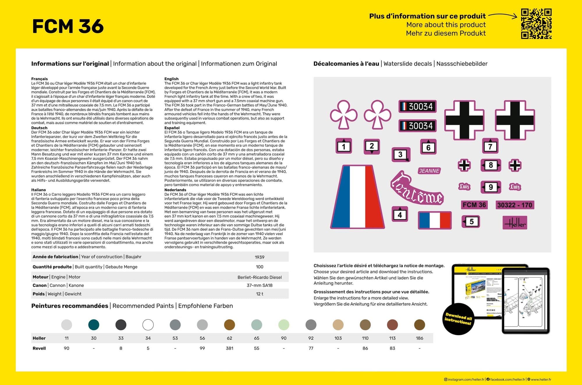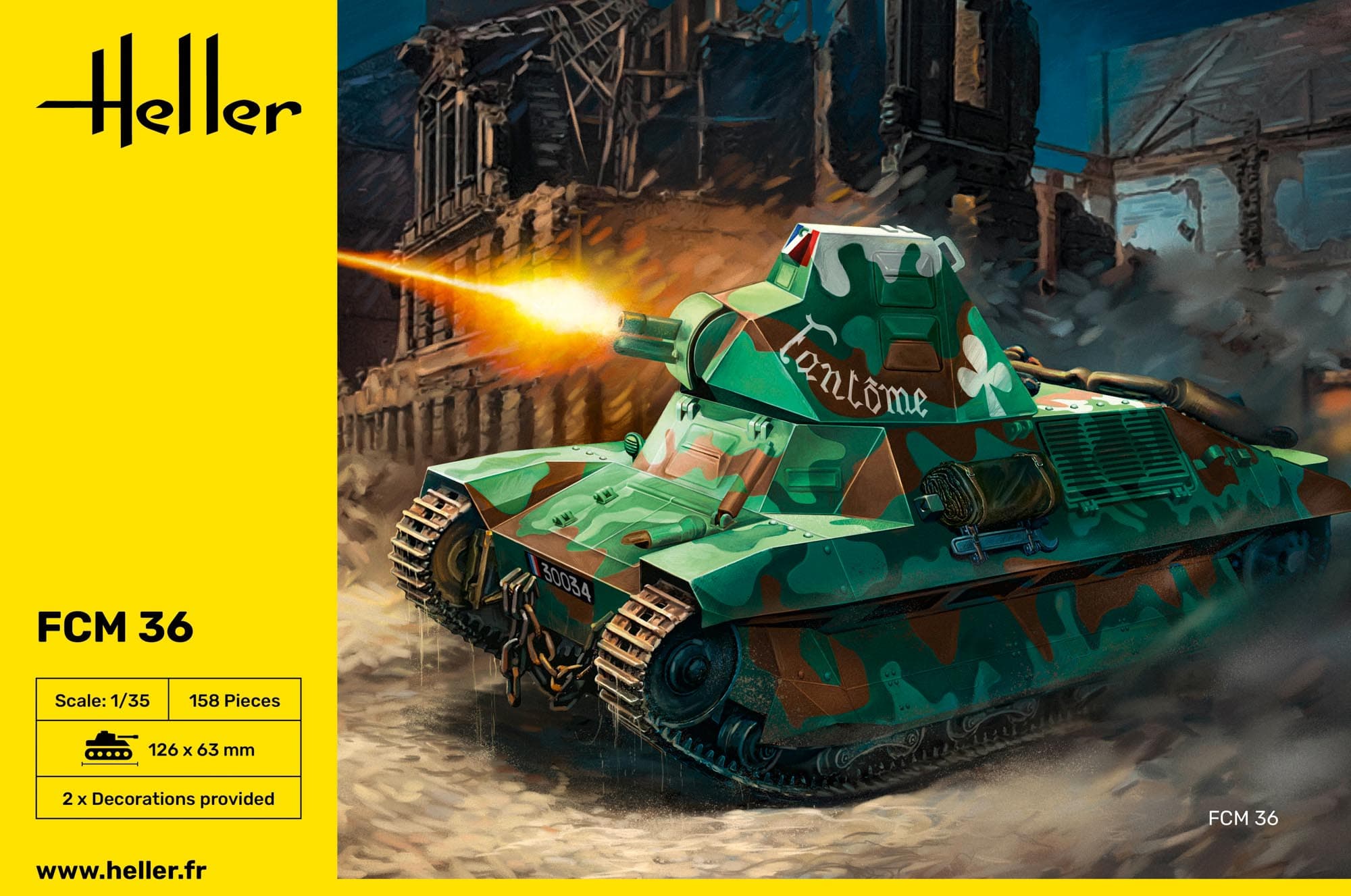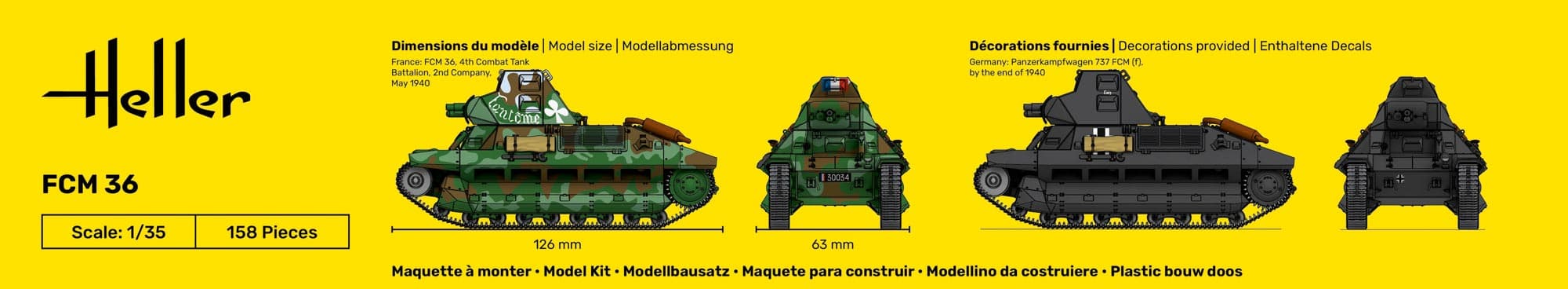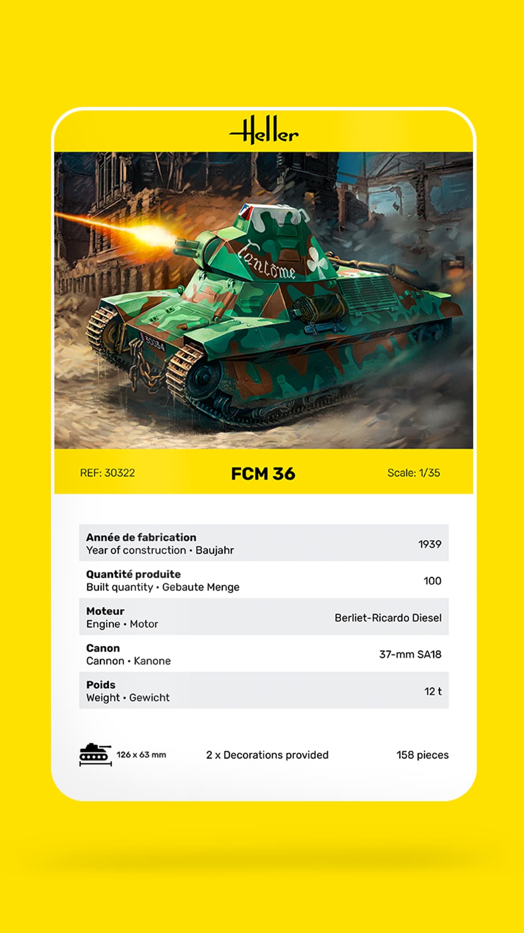 Der Bausatz enthält 158 Einzelteile und ermöglicht den Zusammenbau eines authentischen Nachbaus des FCM 36 mit originalgetreuen Details. Die beiliegenden Decals erlauben die Gestaltung in verschiedenen historischen Varianten – darunter auch die Wehrmacht-Beuteversion von 1940.