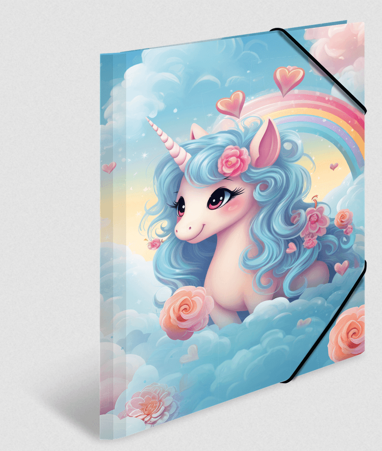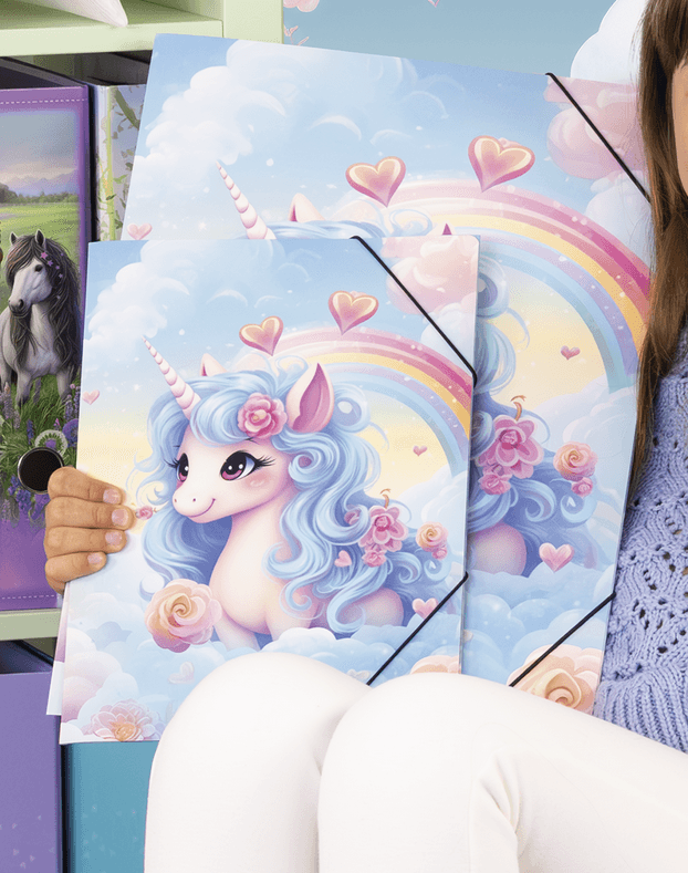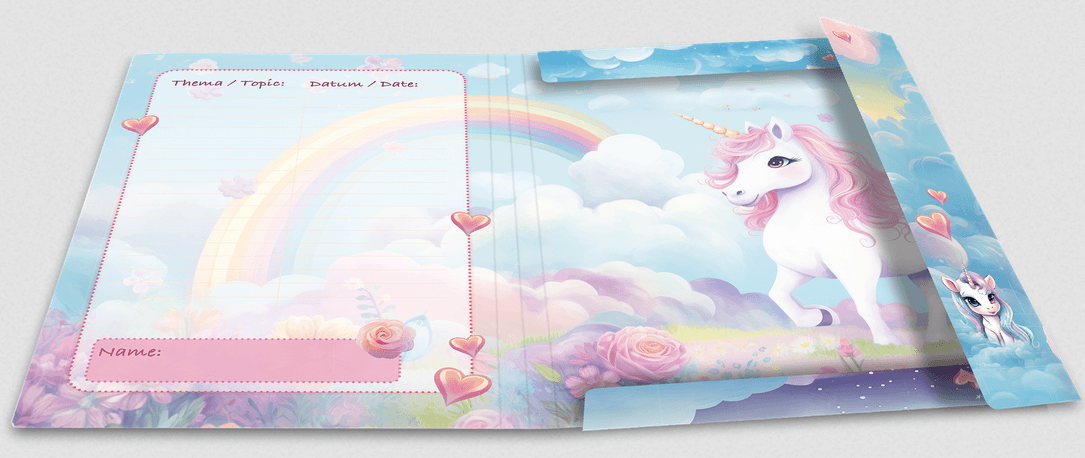 Eintauchen in die magische Welt der Happy Unicorns! Diese liebevoll gestaltete Sammelmappe für das Format DIN A3, aus Karton, ist der ideale Begleiter für alle Einhorn-Fans. Die fröhlichen Einhörner mit großen, strahlenden Augen und weichem, hellblauem Fell bringen jedes Gesicht zum Strahlen. Der Hintergrund, verziert mit bunten Wolken, Herzen, Blüten und Regenbögen, verleiht jedem Kinderzimmer oder Schulranzen einen Hauch von Magie. Diese Einhorn-Sammelmappe ist perfekt für kleine Prinzessinnen und Prinzen, die Wert auf Stil und Ordnung legen. Ein Muss für alle, die ihre Schulunterlagen, Bilder und Zeichnungen fantasievoll und ordentlich aufbewahren möchten!