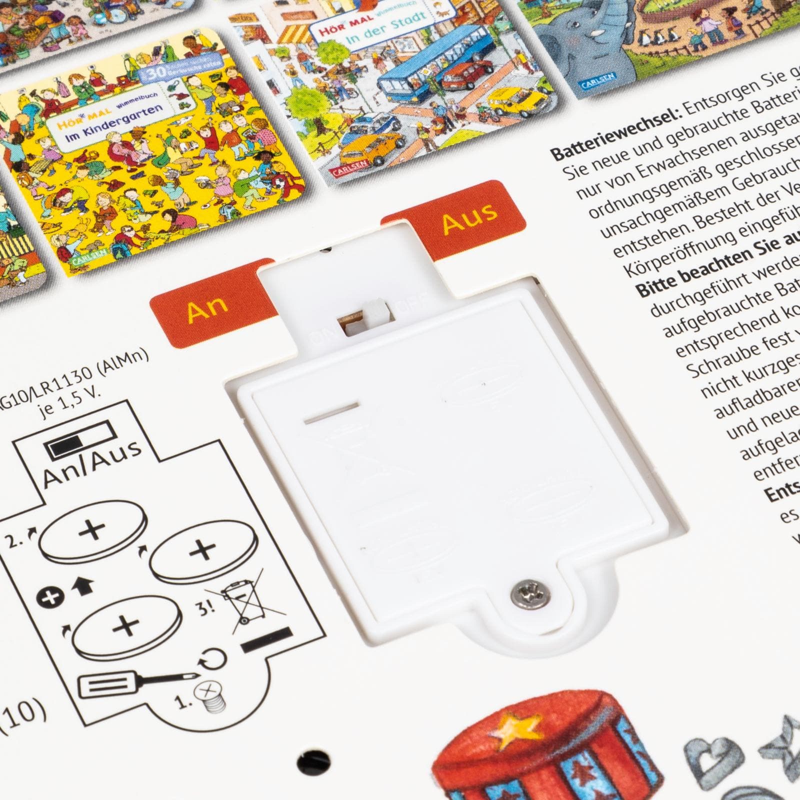 In diesem Soundbuch wimmelt es von Sachen zum Suchen und spannenden Rätsel-Geräuschen!Zusammen die Wartezeit bis Weihnachten verkürzen! Mehr als 30 Vignetten und Sounds auf 6 Wimmelbildern begleiten durch die Advents- und Weihnachtszeit. Ob in der Engelsbäckerei, beim Weihnachtsmann, seinen Rentieren und den Wichteln oder beim Basteln in der Kita, beim Krippenspiel und auf dem Weihnachtsmarkt: Hier hören Kinder lustige Geräusche und stimmungsvolle Melodien und entdecken immer wieder neue Bilddetails, die zum Erzählen einladen.Kleine Bildchen am Rand laden zum gezielten Suchen und Finden ein. Ein silberne Druckknopf auf jeder Seite löst verschiedene Geräusche und kurze Redesequenzen aus, deren Verursacher ebenfalls in den großen Wimmelbildern gesucht werden können. Mit der Zeit werden so auch Kleinkinder zu echten Spürnasen! Ein großer und vor allem langanhaltender Rätselspaß für alle Sinne zum Lernen, Freuen und Wachsen.Das bietet das Hör-mal-Soundbuch:6 leicht auslösbare Sounds mit einer Gesamtspielzeit von bis zu 100 SekundenAktivierung und Deaktivierung der Geräusche durch Druck auf die silbernen Punkte auf jeder DoppelseiteEinfaches Auswechseln der Batterien, wenn die Sounds nicht mehr die volle Spielzeit haben oder sich nur noch schwer auslösen lassen.Problemlose Bedienung ab 2 Jahren (Bei jüngeren Kindern sollten die Eltern die Soundbuttons drücken, da die Feinmotorik und Kraft der kleinen Finger noch nicht ausreicht.)*** Alle Titel der Reihe unterliegen strengen Sicherheitsanforderungen und Qualitätskontrollen. Jeder Soundknopf wird vor der Auslieferung auf seine Funktionsfähigkeit geprüft. Die Lautstärke der Sounds entspricht den Vorgaben der europäischen Spielzeugrichtlinie. Ausgeliefert werden die Bücher mit 3 handelsüblichen Knopfzell-Batterien LR 1130 mit je 1,5 V. ***