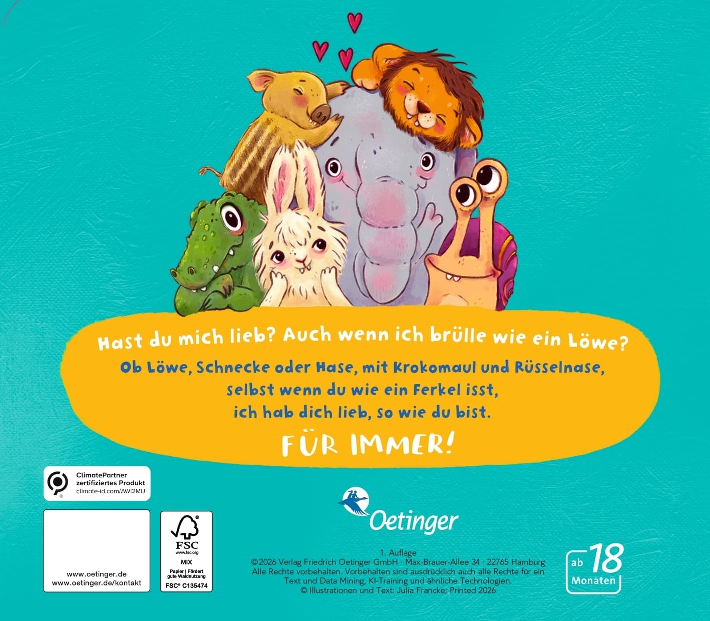 Hast du mich immer lieb? Auch wenn ich brülle wie ein Löwe, krieche wie eine Schnecke oder matsche wie ein Wildschwein? Trödeln, Beißen, Matschen, Lärmen und große Gefühle haben: Der Alltag mit Kleinkindern steckt voll kleiner und großer Herausforderungen. Die beste Lösung: Liebhaben – ohne Wenn und Aber!