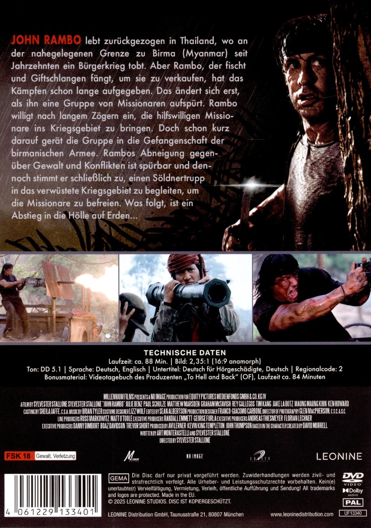 John Rambo führt ein zurückgezogenes Leben im Norden Thailands. An der Grenze des Landes zu Burma wütet allerdings schon seit sechzig Jahren der weltweit längste Bürgerkrieg: der Burmesen-Karen Konflikt. Rambo, der in den Bergen lebt, und seinen Lebensunterhalt mit dem Verkauf selbst gefangener, giftiger Schlangen verdient hat das Kämpfen jedoch schon lange aufgegeben. Das ändert sich auch nicht, als Sanitäter, Rebellen und Flüchtligen an ihm vorbei durch das von Krieg zerrüttete Land ziehen. All dies soll sich aber ändern, als eine Gruppe von Missionaren auftaucht und den »Amerikanischen-Fluss-Führer« Rambo bittet, sie den Fluss hinauf zu einem Flüchtlingslager zu führen, da Tretminen die Reise dorthin zu gefährlich macht. Sie wollen den dort lebenden, verfolgten Bergstamm Karen mit Medizin, Nahrungsmitteln und Bibeln versorgen. Zögernd willigt Rambo schließlich ein, sie und die anderen Helfer zu führen. Wochen später erfährt Rambo, dass die Missionare nicht vom Flüchtlingslager zurückgekehrt sein, die Helfer aber lebend gesehen worden sind, eingeschlossen in einem Burmesischen Armee-Camp. Obgleich Rambos Abneigung gegen Gewalt noch immer allgegenwärtig ist, weiß er, dass seine Hilfe notwendig ist. Was dann folgt ist der Abstieg in die Hölle auf Erden.