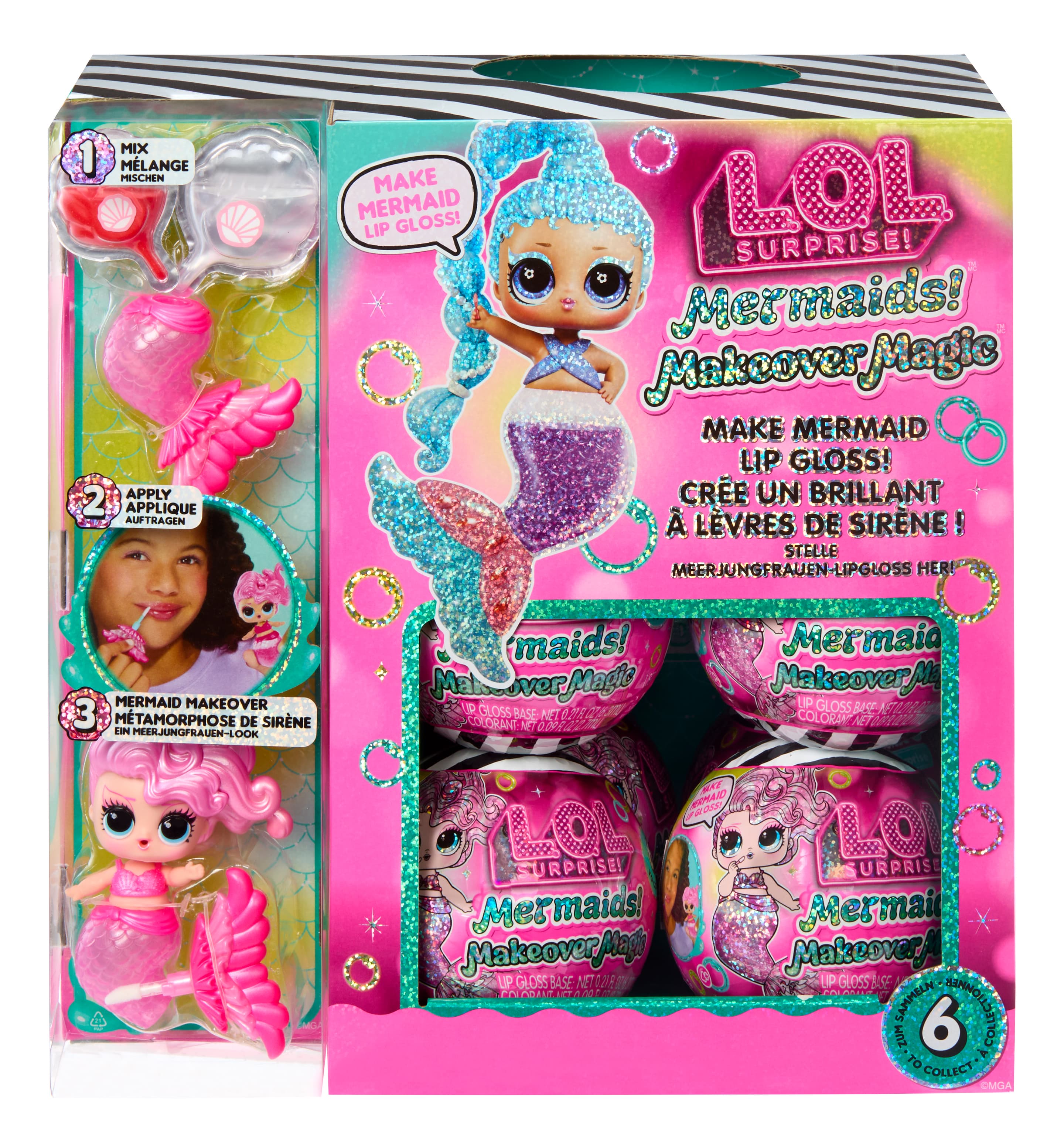 Entdecke die magische Welt der L.O.L. Surprise! Meerjungfrauen – jetzt mit Lipgloss-Funktion! Jede der sechs einzigartigen Meerjungfrauen-Charaktere begeistert mit einer transparenten Flosse, in der du deinen eigenen Lipgloss direkt anmischen kannst. Einfach die Farbe deiner Figur verwenden, mischen und mit der Flosse als Applikator auftragen – so wird jede Überraschung zum Beauty-Highlight. Jede Figur bringt ihre eigene Lipglossfarbe mit und ist selbstverständlich wasserfest – perfekt zum Spielen in der Badewanne oder am Pool. Sammle alle acht Meerjungfrauen und tauche ein in kreativen Spiel- und Beautyspaß! 6 Meerjungfrauen mit Lipgloss-Flosse. Anmischen, auftragen und sammeln. Inkl. Outfit & Accessoires. Ab 4 Jahren.