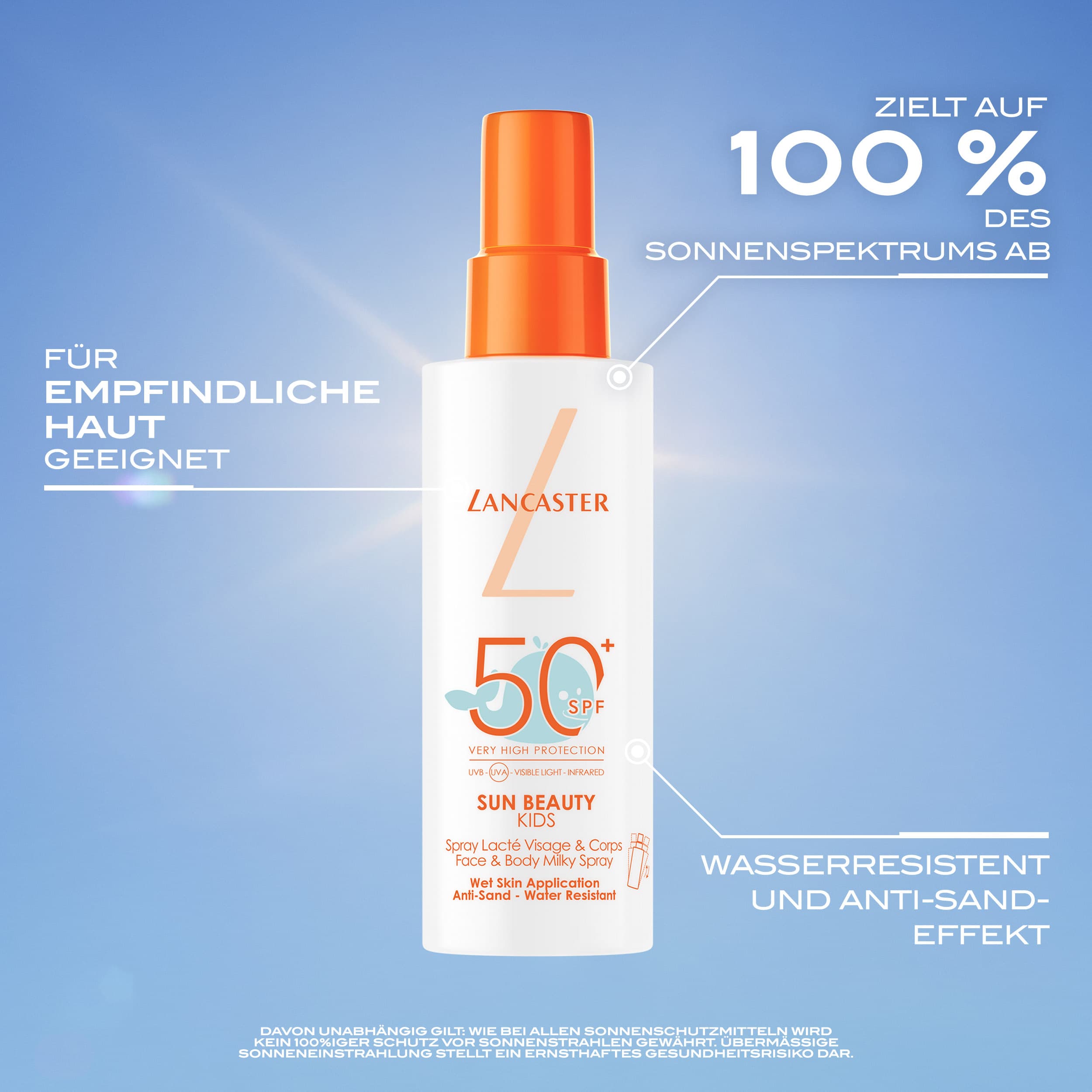 Der Sun Beauty Kids Milky Spray SPF50+ von Lancaster, der Nr. 1 Prestige-Sonnenschutzmarke in Europa1, schützt Kinderhaut über herkömmlichen UV-Schutz hinaus. Die Einwirkung von Sonnenlicht ist für 80 % der sichtbaren Alterungsanzeichen2 verantwortlich, ein Prozess, der als lichtbedingte Hautalterung bekannt ist. Da UVA- und UVB-Strahlen nur 10 % des Sonnenspektrums ausmachen, geht unsere Formulierung über herkömmlichen Sonnenschutz hinaus und schützt vor sichtbaren Licht- und Infrarotstrahlen. Unsere Full-Light TechnologieTM bietet einen 10-mal umfassenderen Sonnenschutz*. 1Insgesamt, 5 europäische (FR, DE, UK, IT & ES) Prestigemärkte & -marken. In Wert & Einheiten, 2017 bis Juni 2024. Circana Group L.P/BeautyTrends®. 2Die Weltgesundheitsorganisation & Yale Medicine, Studie zu lichtbedingter Hautalterung.