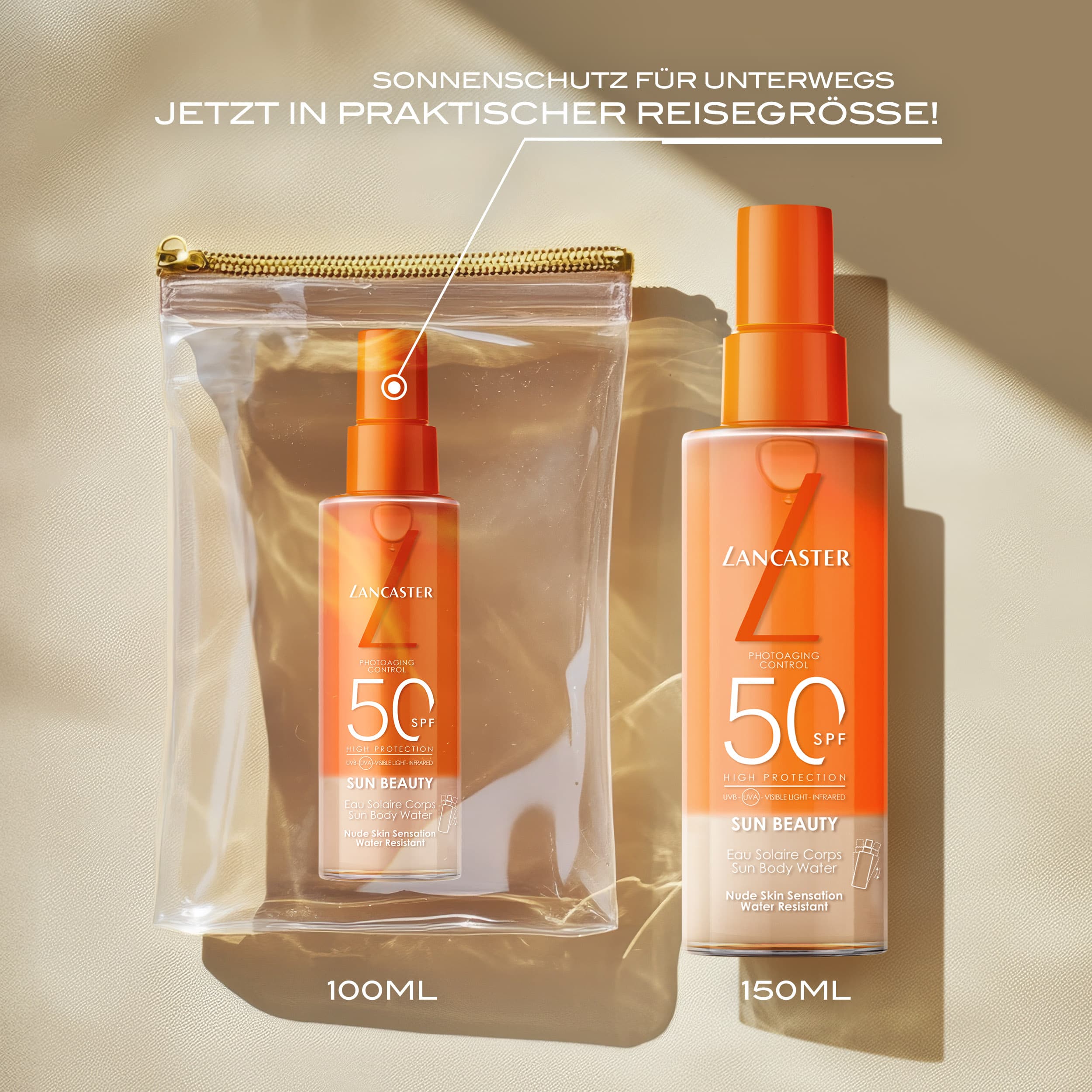 Das Lancaster Sun Beauty Sun Body Water SPF 50 ist der ultimative Verbündete gegen lichtbedingte Hautalterung. Unsere Full-Light TechnologieTM bietet einen 10-mal umfassenderen Sonnenschutz*.