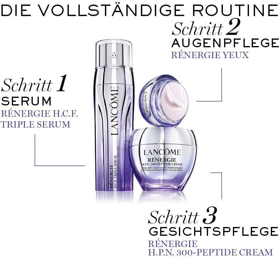 | Anwendungshinweis | Die Lancôme Rénergie H.P.N. 300-Peptide Creme täglich am Morgen auf die zuvor gereinigte, trockene Haut im Gesicht, am Hals und am Dekolleté auftragen und sanft mit Hilfe der Fingerspitzen einklopfen. Für optimale Resultate, die Anti-Aging-Creme regelmäßig und über einen längeren Zeitraum anwenden. |