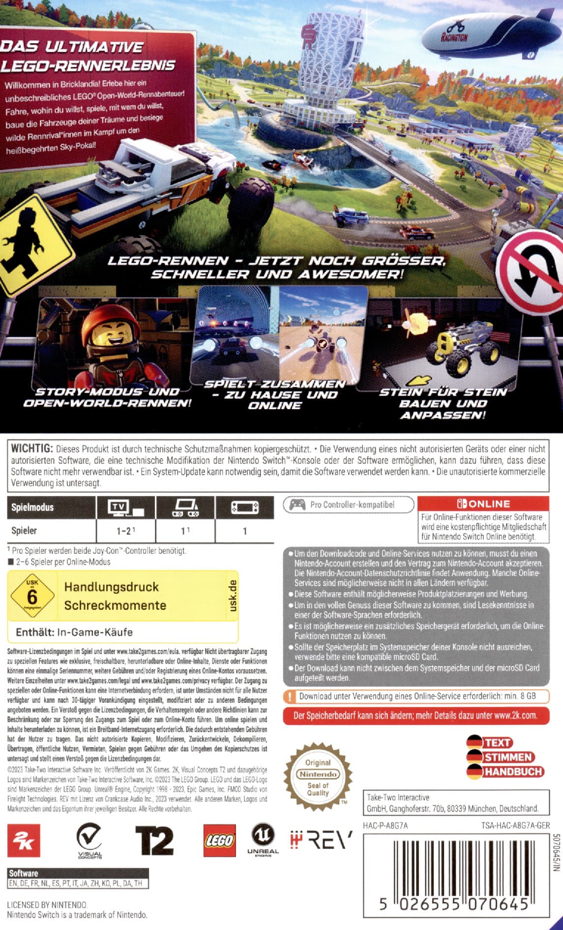 Willkommen bei Bricklandia, der Heimat eines riesigen LEGO® Open-World-Rennabenteuers. Fahr frei herum, spiele mit wem du willst, bau die Fahrzeuge deiner Träume und besiege einen Cast wilder Rennrivalen im Kampf um den heißbegehrten Sky Pokal! Bei LEGO 2K Drive kannst du in deinem Awesome Transforming Vehicle völlig frei und übergangslos über spannende Strecken, Gelände oder sogar Wasser rasen. Entdecke die riesige Welt von Bricklandia, zeig dein Fahrkönnen und baue Fahrzeuge Stein für Stein!