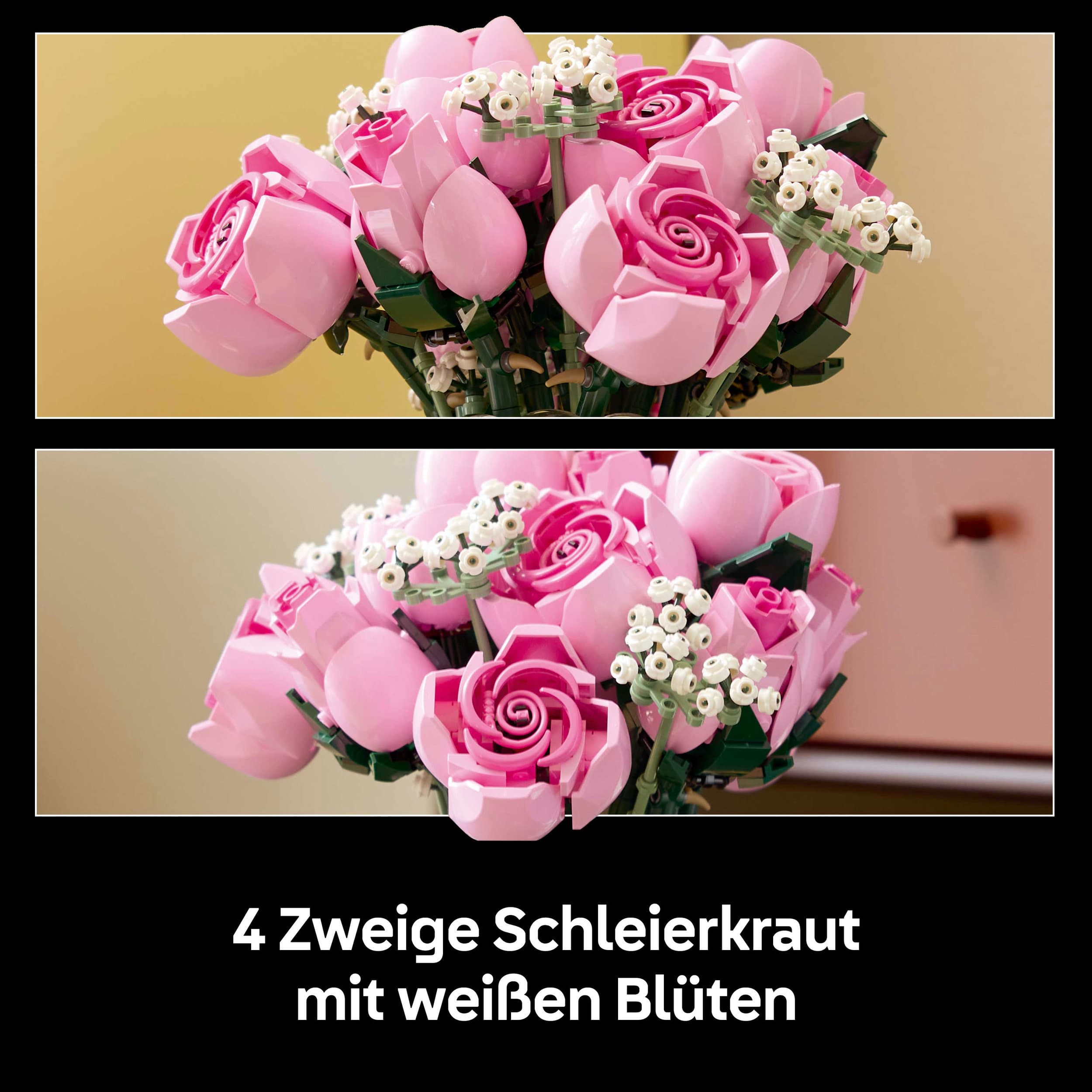 • BLUMEN AUS LEGO IN VERSCHIEDENEN STADIEN: Das Set beinhaltet 4 Rosen in voller Blüte, 4 aufgehende Rosen und 4 Rosenknospen sowie 4 Schleierkrautzweige mit weißen Blüten