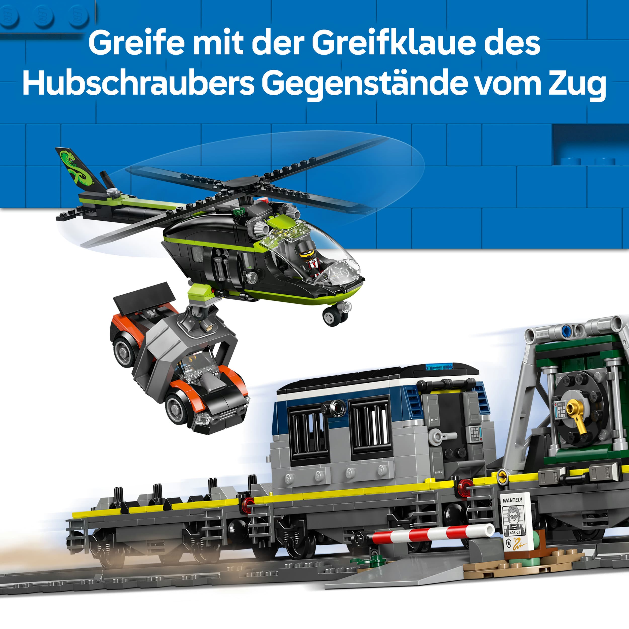 • SPIELSET MIT VIEL ZUBEHÖR: Kinder finden hier alles, was sie brauchen, um eine Lok, 3 Flachwagen, 1 Rallyeauto, 1 Hubschrauber, 1 Gefängniszelle, 1 Tresor, 1 Bahnübergang und 1 Figuren Team zu bauen