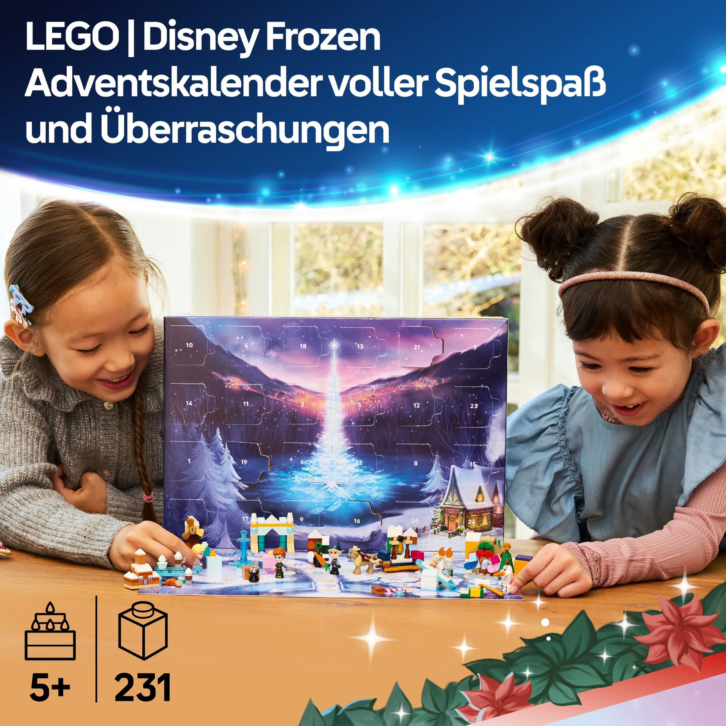 • Bauset für Kinder: Hinter einigen Türchen kommen baubare LEGO ǀ Disney Spielzeuge zum Vorschein, unter anderem eine Wippe, ein Lebkuchenhaus, Sir Jorgenbjorgen, ein Kamin mit Strümpfen und Kranz sowie Geschenke