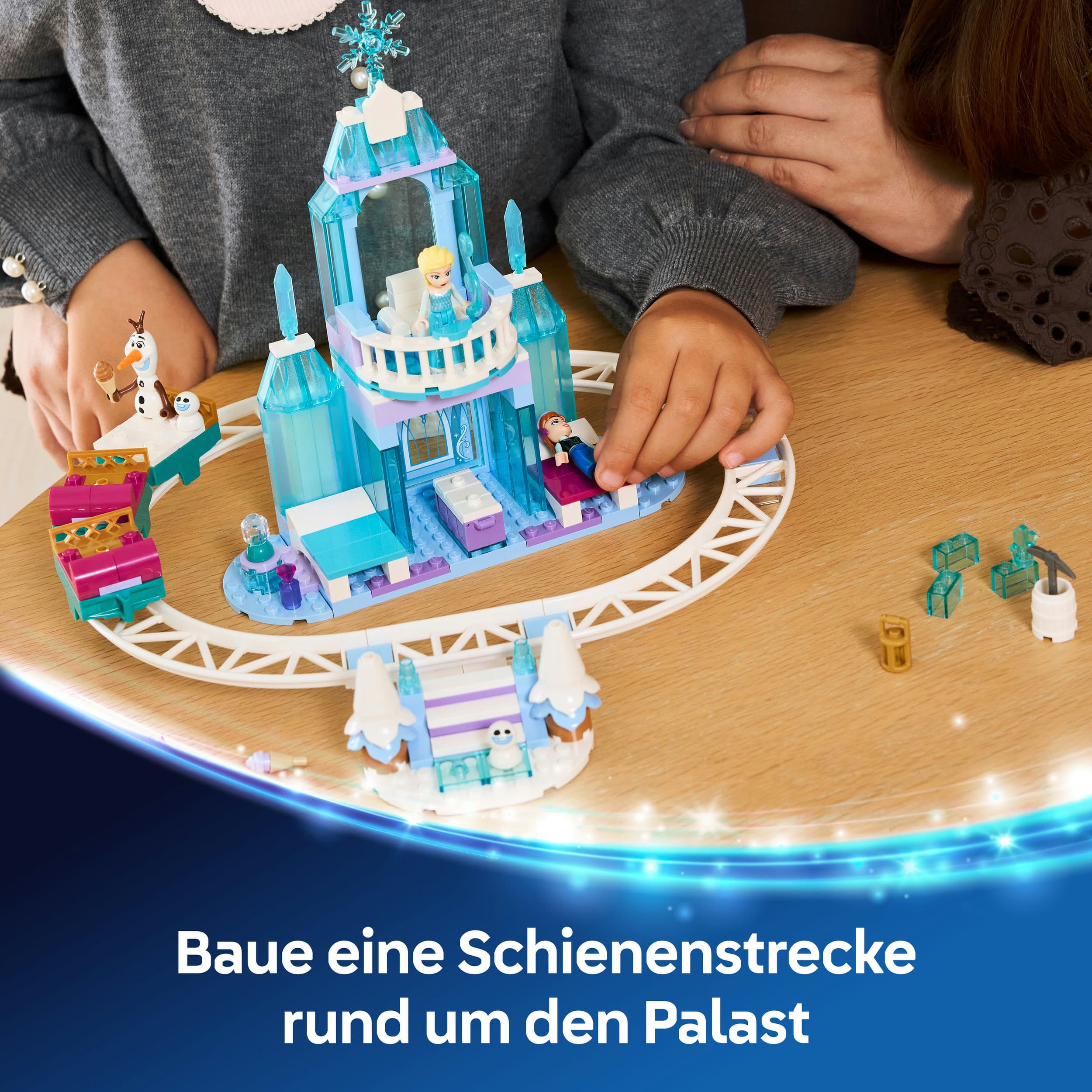 Mit LEGO | Disney Frozen Elsas Schlittenfahrt um den Eispalast (43281) erleben Kinder ab 4 Jahren eine zauberhafte Reise durch die Welt von Arendelle. Dieses vielseitige Bau- und Spielset enthält einen detailreichen zweistöckigen Eispalast, eine kleine Zugstrecke mit drei Schlittenwagen, eine Rutsche für die Schneemännchen und ein drehbares Karussell, alles, was es für fantasievolles Spielen rund um Elsa, Anna und Olaf braucht.