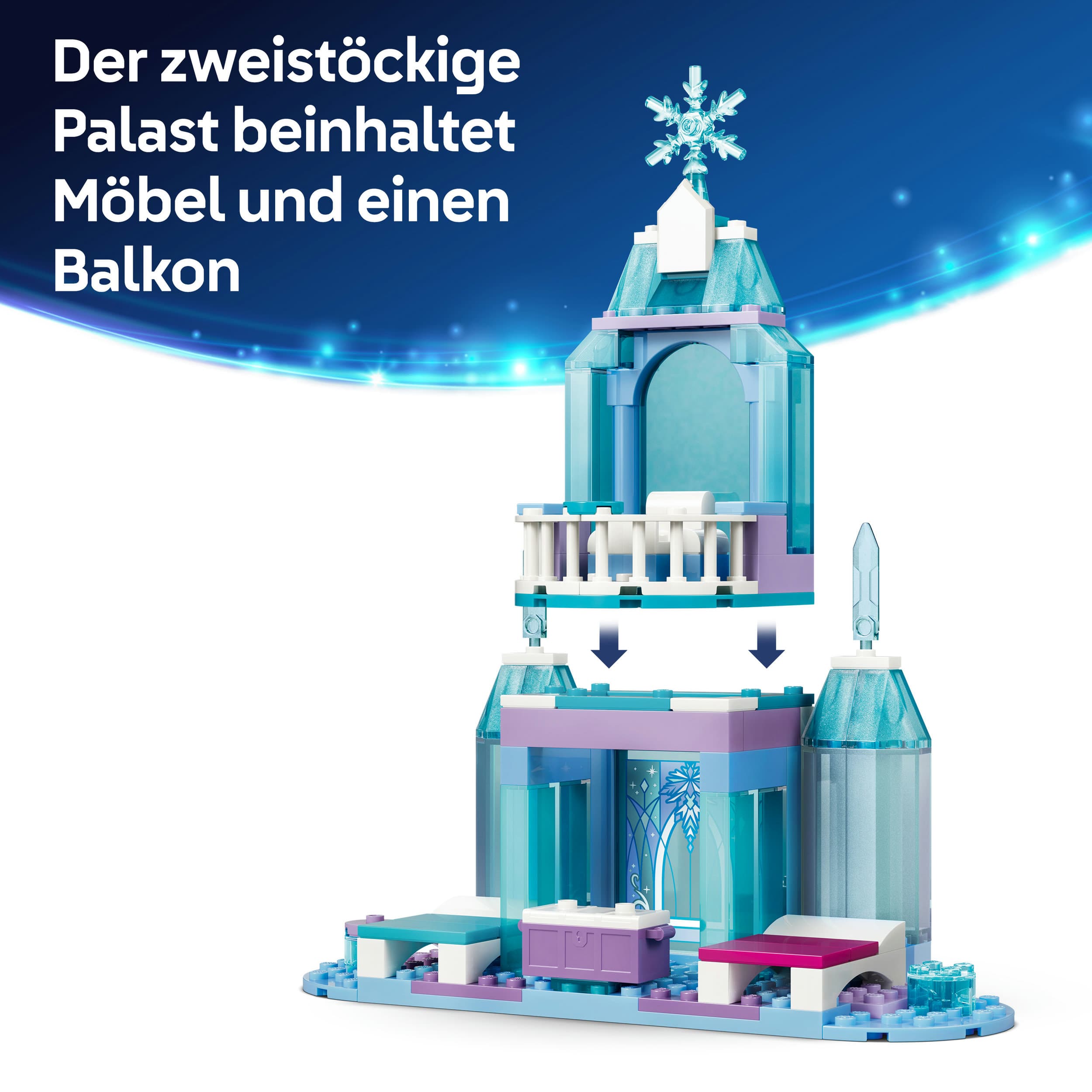 Mit dabei sind sieben beliebte Disney Frozen Figuren: Elsa, Anna, Olaf, Bruni und drei Snowgies, die auf den Schlittenwagen Platz nehmen können. Kinder können den Palast erkunden, auf dem Balkon Geschichten erfinden oder mit Zubehör wie einer Truhe mit Krone und Zepter spannende Rollenspiele gestalten. Die beweglichen Elemente und kreativen Spielmöglichkeiten fördern Feinmotorik, Vorstellungsvermögen und Geschichtenerzählen.