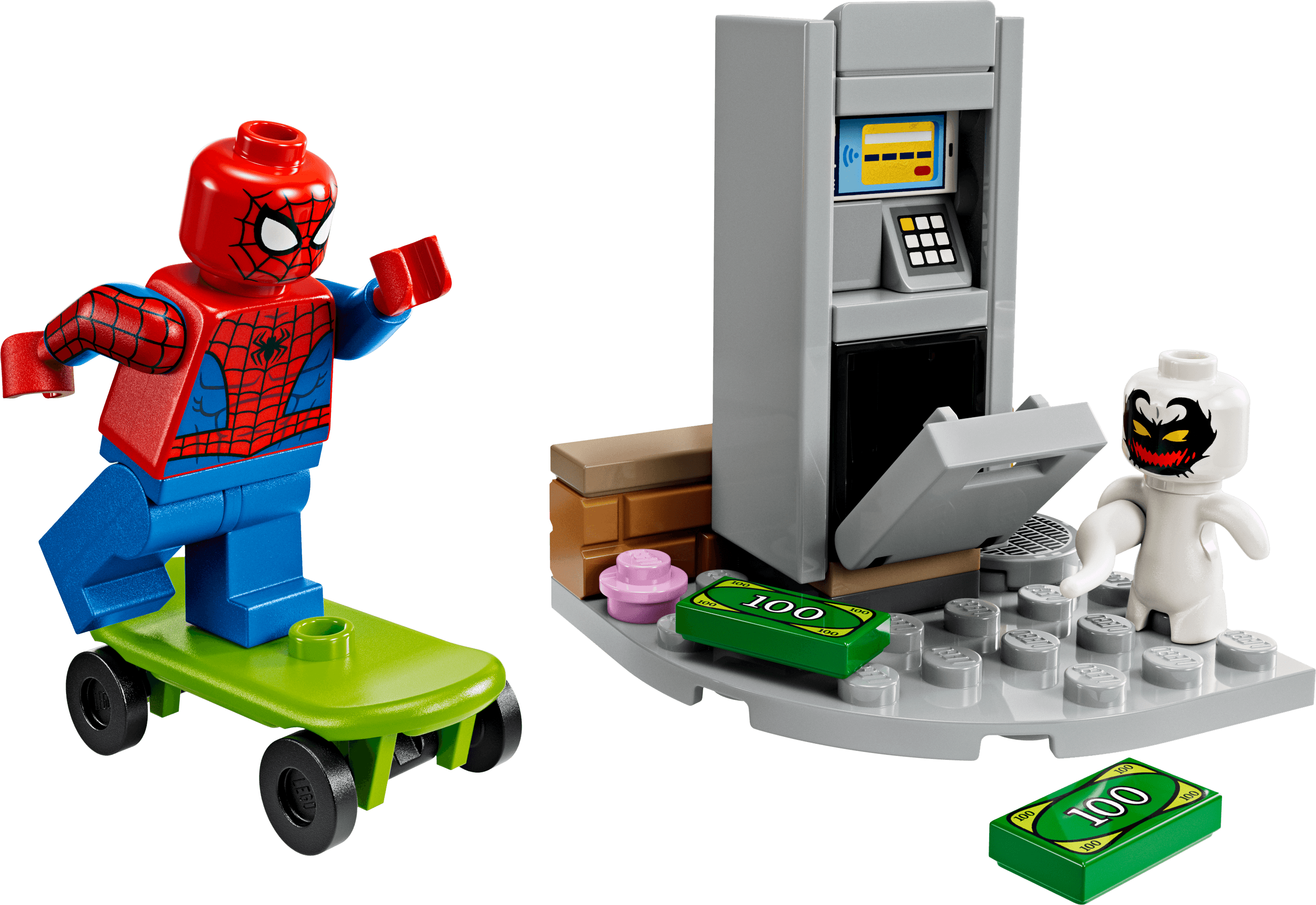 Anti-Venom bricht einen Geldautomaten an der Straßenecke auf. Spider-Man sieht, wie der Bösewicht mit einem Geldbündel davonläuft und jagt ihm auf dem Skateboard hinterher.