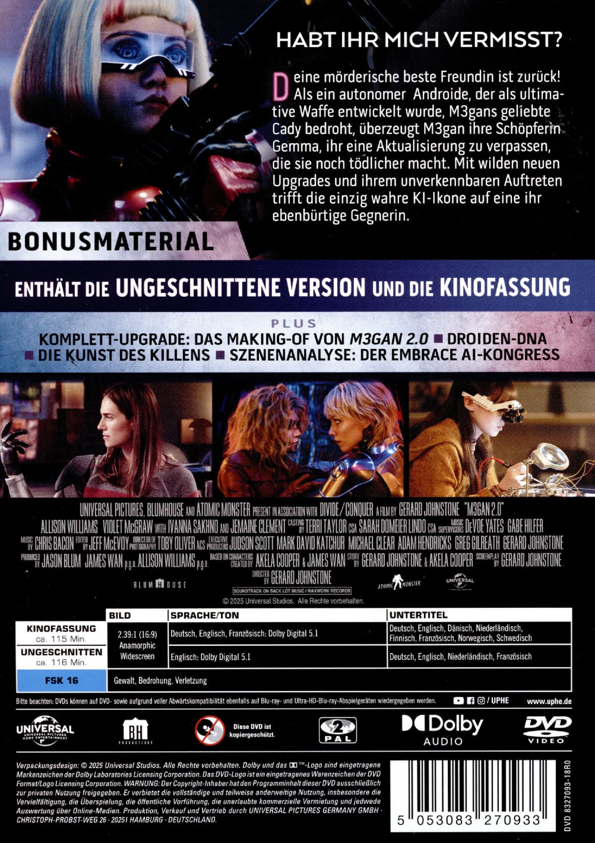 | Zusatzinfos / Bonusmaterial beim Film dabei | Enthält die ungeschnittene Version und die Kinofassung,Komplett-Upgrade: Das Making of von "M3gan 2.0",Droiden-DNA,Die Kunst des Killens,Szenenanalyse: Der Embrace AI-Kongress |