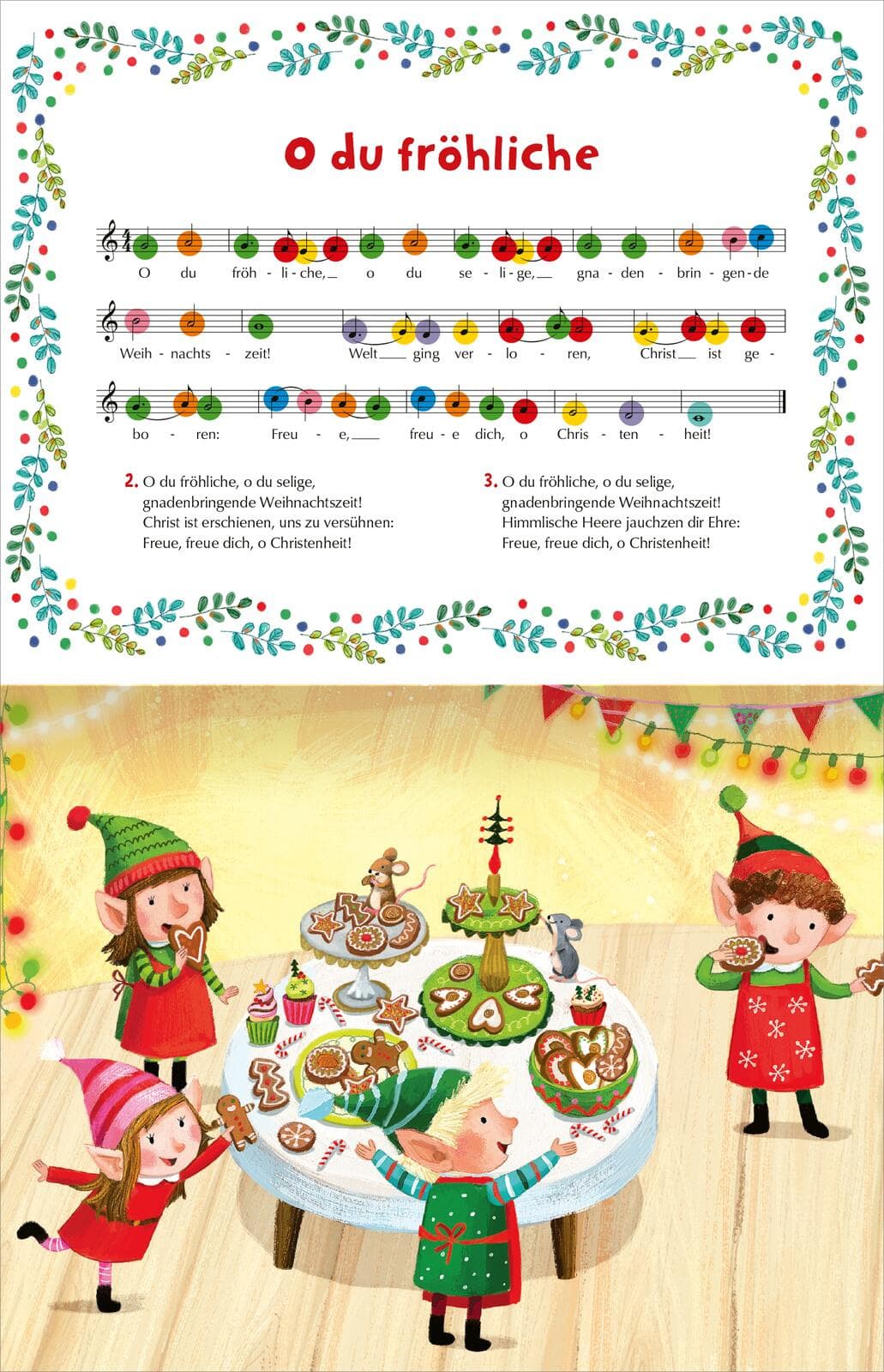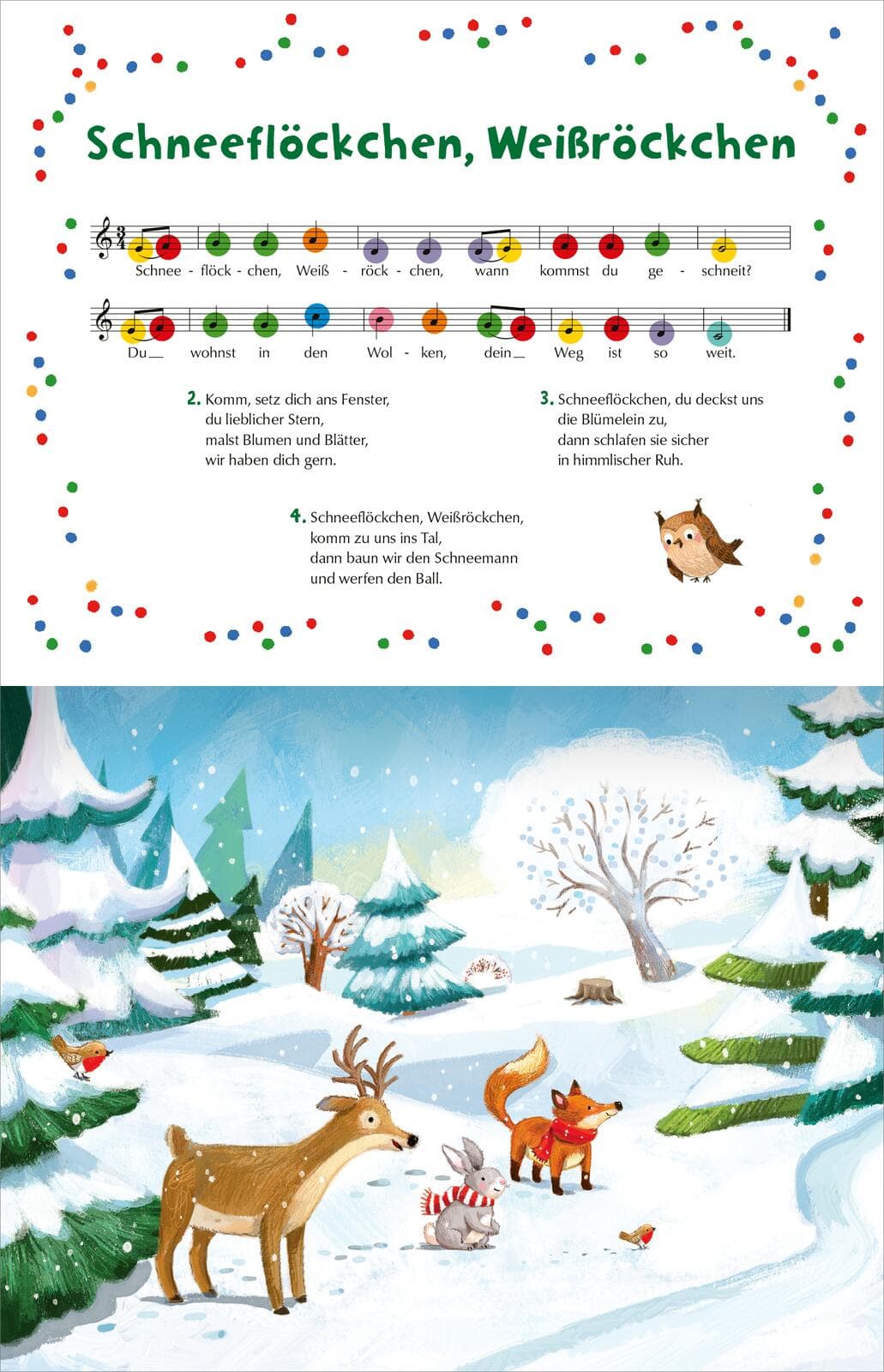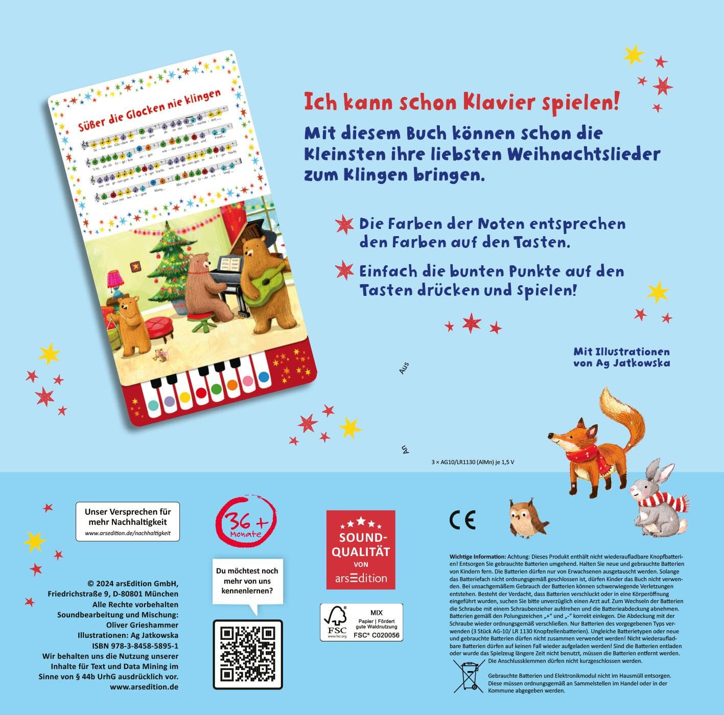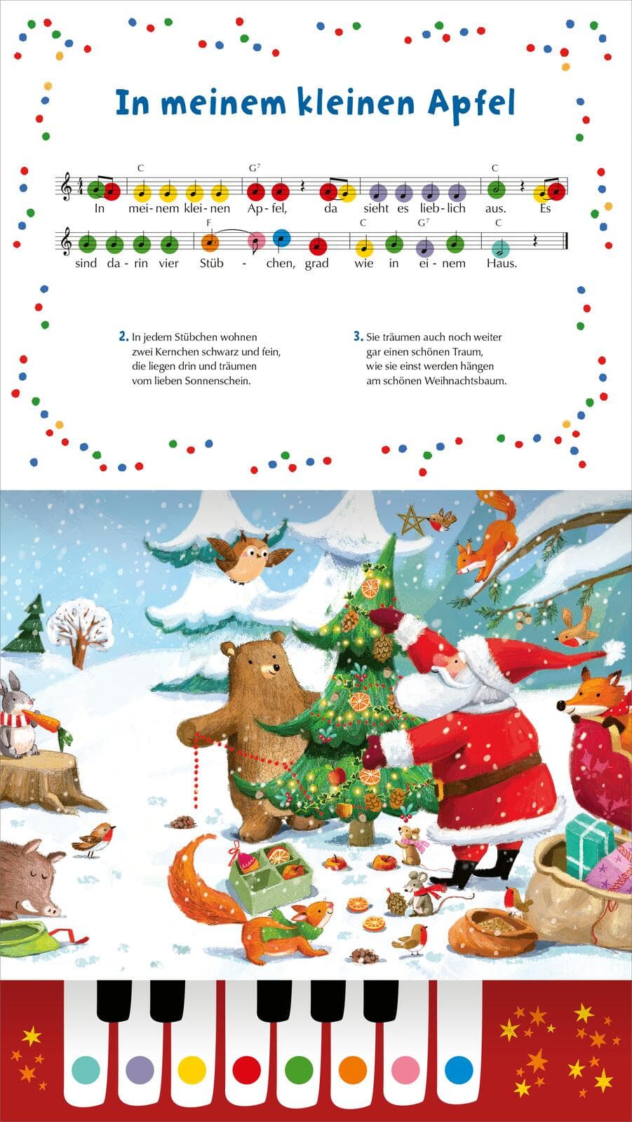 Weihnachtlicher Musikspaß für kleine KlavierkünstlerMit diesem Klavierbuch können schon die Kleinsten ihre liebsten Weihnachtslieder selbst zum Klingen bringen. Auf zehn wunderschön illustrierten Doppelseiten finden sich Notensätze und Liedtexte für beliebte Weihnachtslieder wie „Schneeflöckchen, Weißröckchen“, „Jingle Bells“ und „O du fröhliche“.Komm, wir spielen unsere liebsten WeihnachtsliederDas liebevoll illustrierte Pappbilderbuch mit „echter“ Klaviertastatur eignet sich für Kinder ab 3 Jahren. Die Noten sind farbig markiert und entsprechen den Farben auf den Tasten. So können schon die Kleinsten „Klavier“ spielen – einfach die farbig markierten Punkte auf den Tasten drücken und los geht’s!Großer Musikspaß: Mit 10 fröhlichen Weihnachtsliedern und bezaubernden Illustrationen für Kinder ab 3 JahrenFreude machen: Ein ideales Geschenk im Advent, zu Nikolaus oder zu WeihnachtenTon abschaltbar: Mit praktischem An- und AusschalterBatterien auswechselbar: Das Buch enthält handelsübliche Knopfzellenbatterien vom Typ LR 1130 mit je 1,5 V, die sich problemlos auswechseln lassenGeprüfte Qualität: Das Buch unterliegt strengen Sicherheitsanforderungen und regelmäßigen Qualitätskontrollen nach europäischer Spielzeugsicherheitsrichtlinie