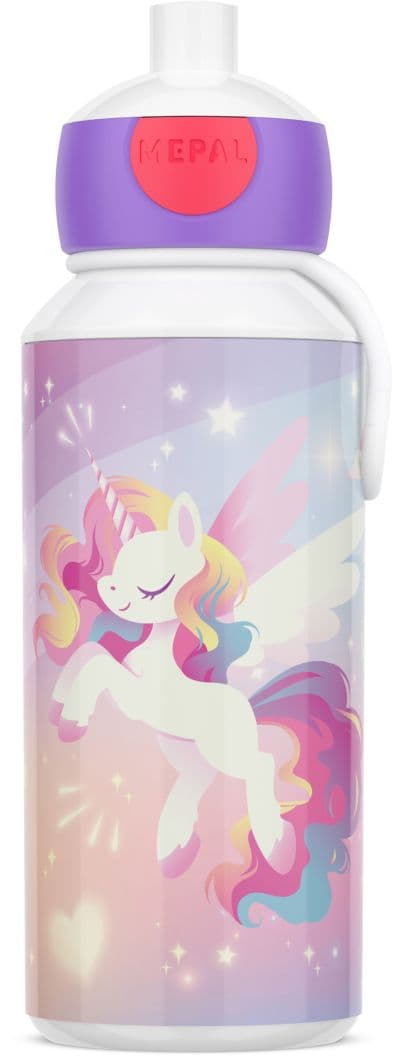 Die auslaufsichere Pop-up-Trinkflasche lässt sich jeden Tag auf Neue unbesorgt im Schulranzen mitnehmen. Die Trinkflasche lässt sich auch von Kindern ganz einfach selbst öffnen und wieder schließen, zudem bietet sie eine praktische Trageschlaufe.