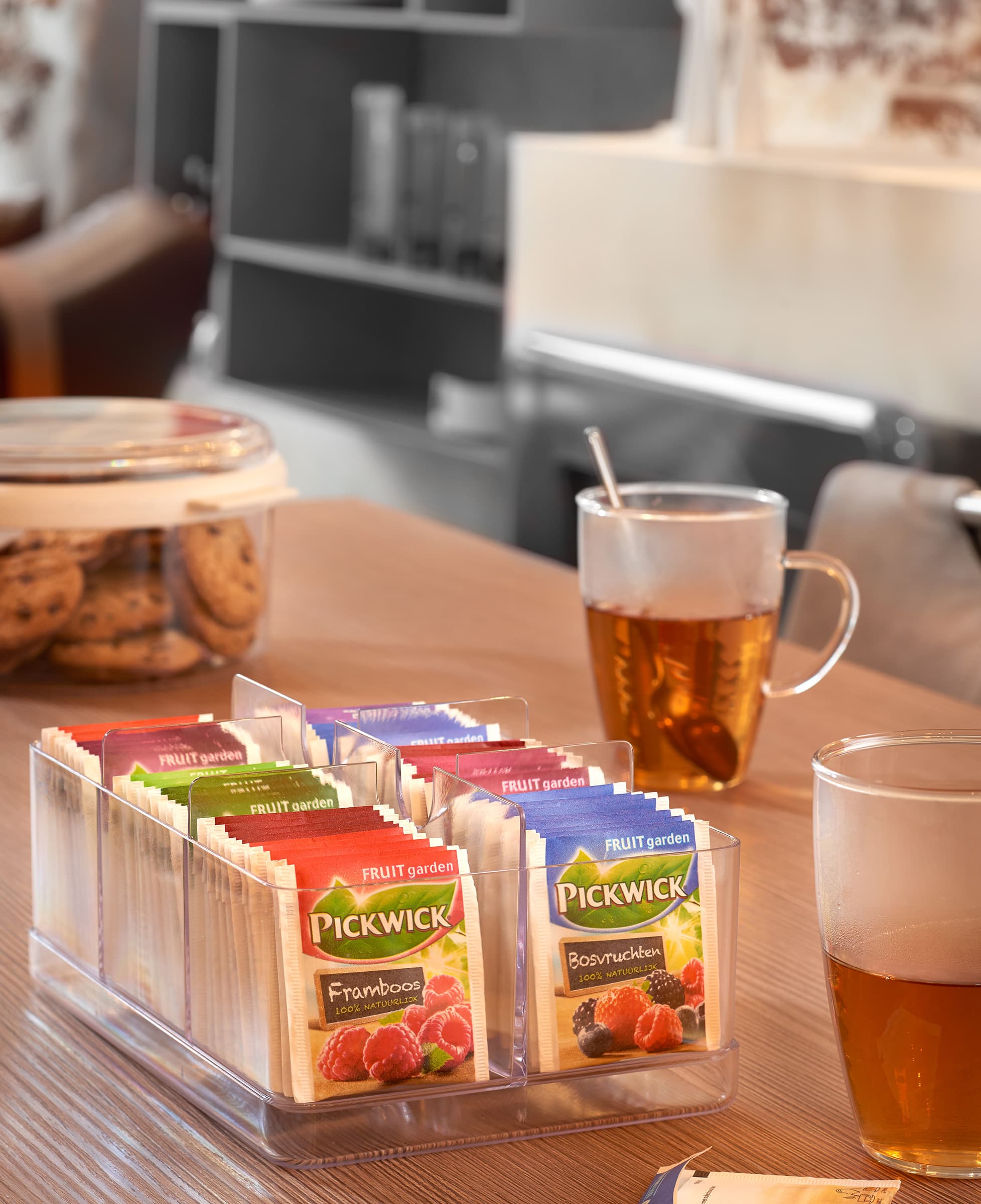 Rechteckige Vorratsdose für Teebeutel von Mepal. In dieser praktischen Form lassen sich bis zu 60 Teebeutel aufbewahren und elegant präsentieren. Durch die praktische Form der Dose, die in 6 Fächer unterteilt ist (jedes Fach bietet Platz für ca. 10 Teebeutel), lässt sich selbst der letzte Teebeutel noch mühelos entnehmen.