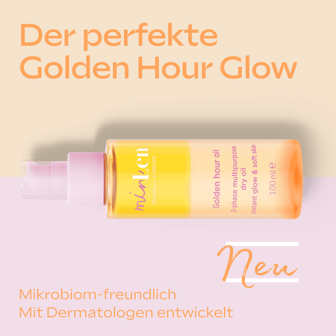 Lässt dich strahlen! Das minLen Golden Hour Oil pflegt die Haut deines Gesichts und deines Körpers nicht nur den ganzen Tag lang mit Feuchtigkeit, sondern zaubert ihr auch sofort einen zarten Glow. Seine 100% Inhaltstoffe natürlichen Ursprungs nähren die Haut und stärken die Hautbarriere. Die 2-Phasen-Formel lässt sich superleicht auftragen und hinterlässt kein fettiges Gefühl. Es eignet sich ideal für zarte, junge Haut.