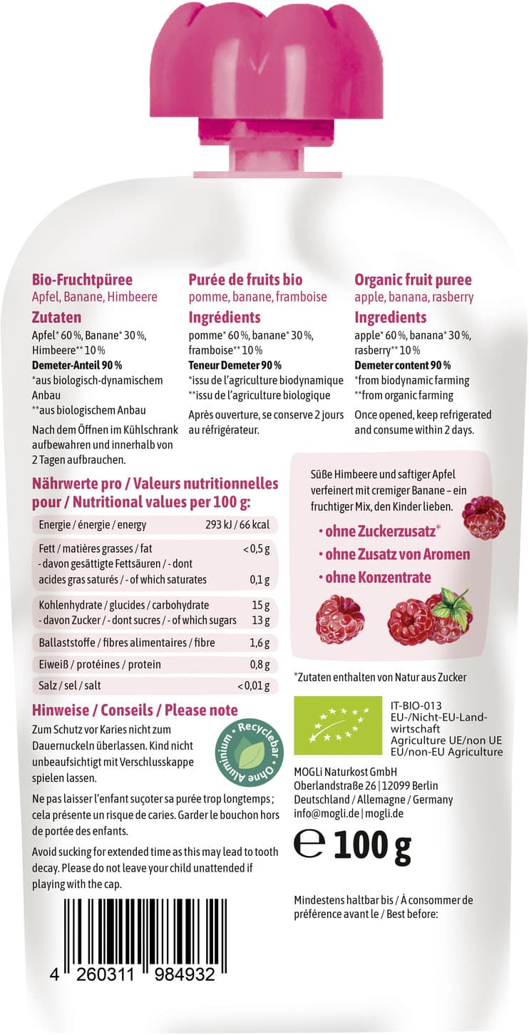 | Zutaten | Demeter Anteil 90%: Apfel* 60%, Banane* 30%, Himbeere** 10% *aus biologisch-dynamischem Anbau **aus biologischem Anbau |