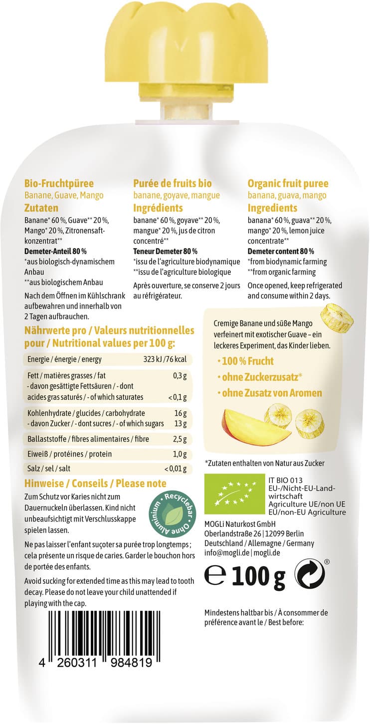 ZutatenDemeter-Anteil 80%: Banane* 60%, Guave** 20%, Mango* 20%, Zitronensaftkonzentrat** *aus biologisch-dynamischem Anbau ** aus biologischem Anbau