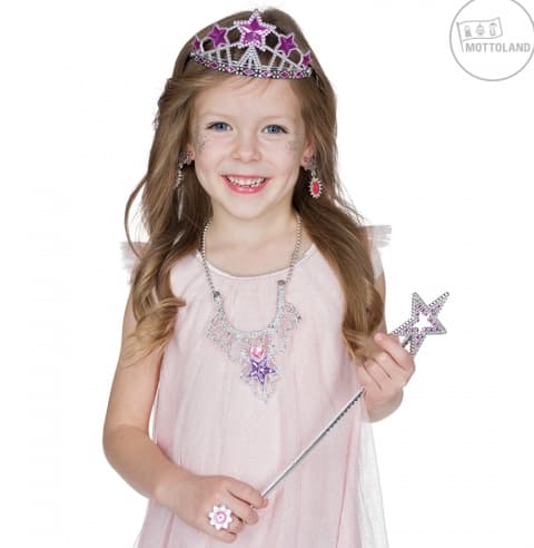 Silbernes Schmuckset mit pinken und lilanen Akzenten. Das Set beinhaltet ein Haarreif mit einem Diadem, einen Ring, ein Paar Ohrclips, eine Collierkette und einen Stab mit Sternenornament.BeinhaltetDiadem, Stab, Ohrringe, Kette, Ring, HaarspangeGewicht (Netto)0.042 kgWarenzusammensetzung100% Polycarbonat