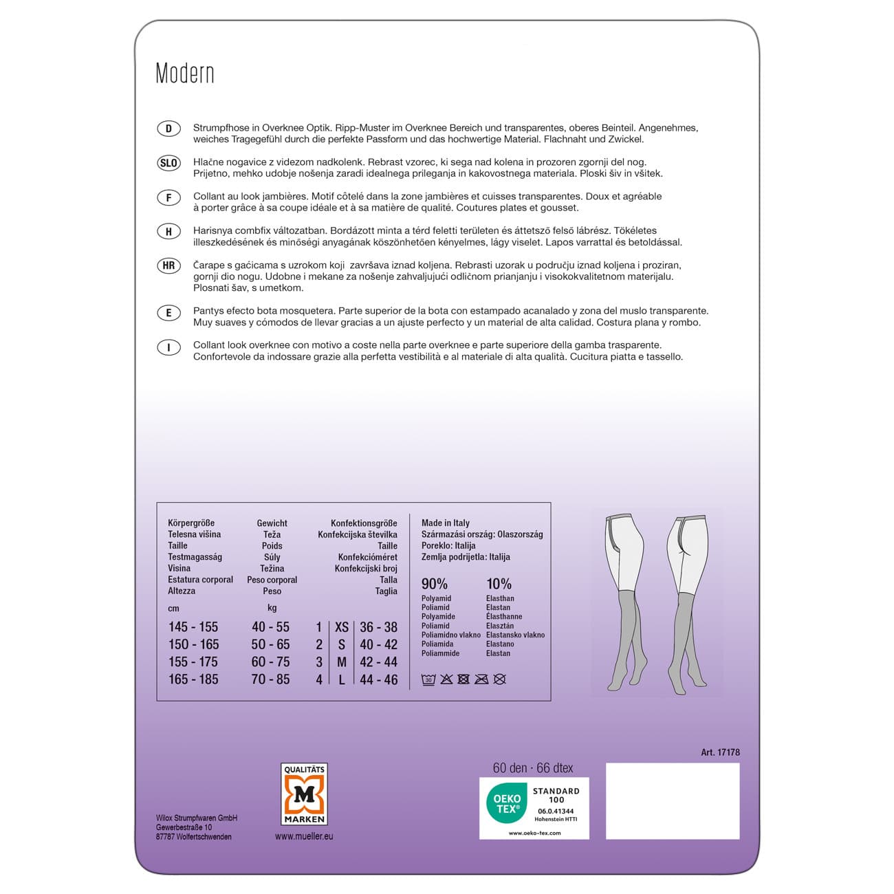 Strumpfhose in Overknee Optik. Ripp-Muster im Overknee Bereich und transparentes, oberes Beinteil. Angenehmes, weiches Tragegefühl durch die perfekte Passform und das hochwertige Material. Flachnaht und Zwickel.