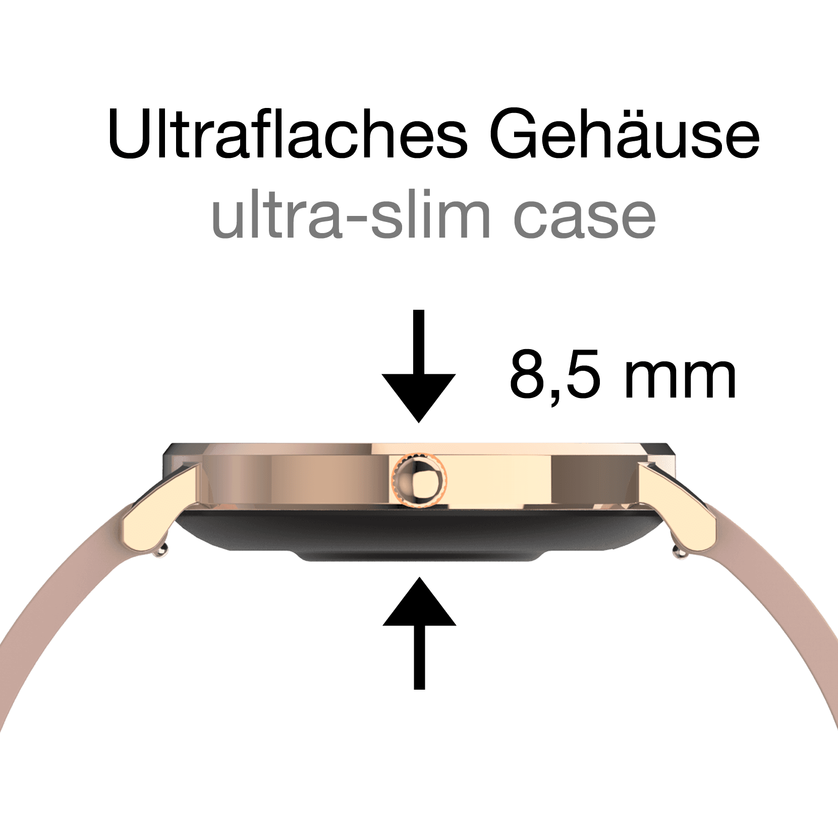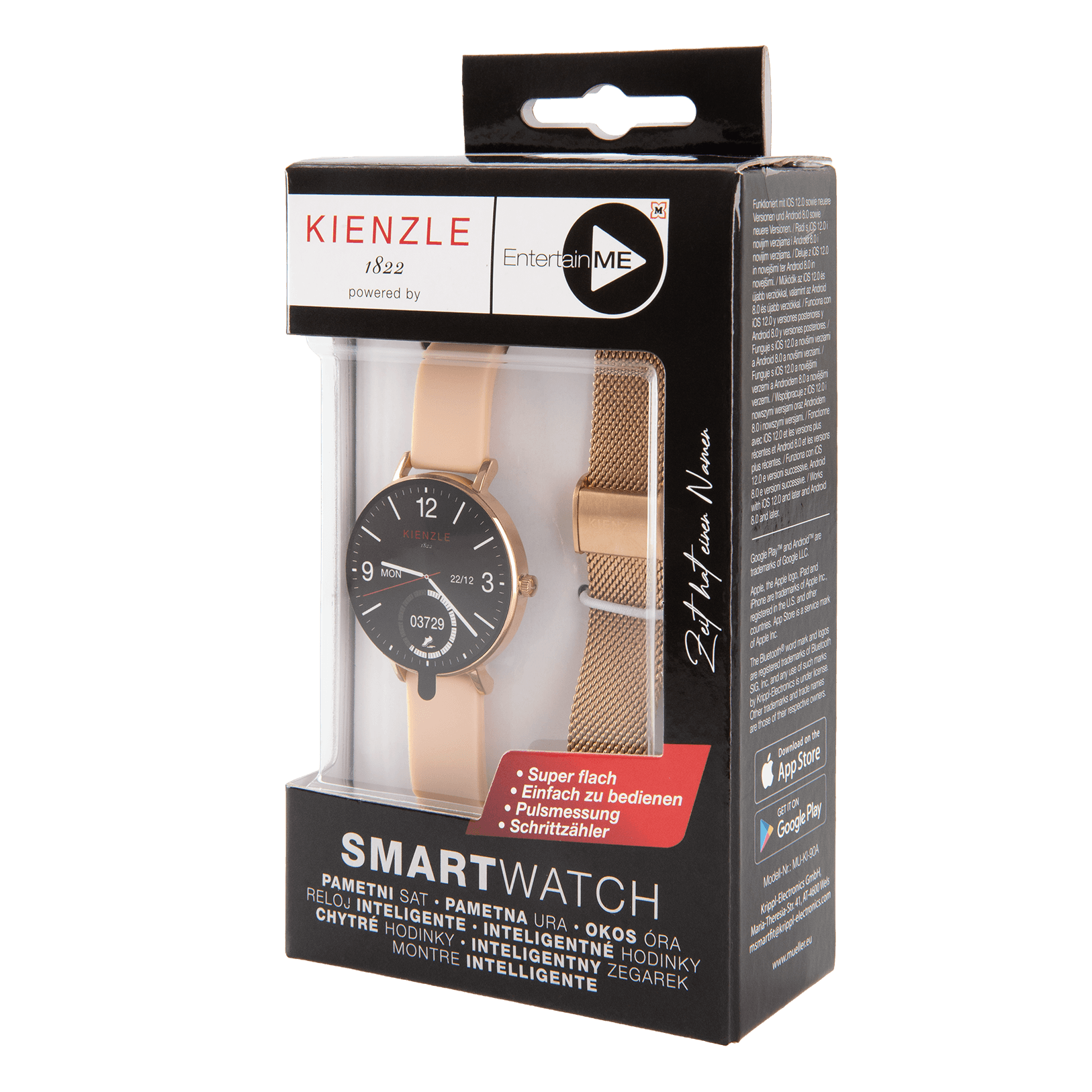 Zeit hat einen Namen! Ihr Lifestyle, ihre Kontrolle – mit der glamourösen SUPERFLACHEN Müller KIENZLE Smartwatch! Verbinden sie sich nahtlos mit der digitalen Welt und behalten Sie Ihr Leben im Griff. Ob Gesundheits-Tracking, Benachrichtigungen in Echtzeit oder stilvolles Design – die Müller KIENZLE Smartwatch bietet ihnen das komplette Paket. Zusätzlich können Sie je nach Anlass einfach zwischen den beiden Bandvarianten (Kunststoff- und Edelstahl Maschenmetallband) wechseln.