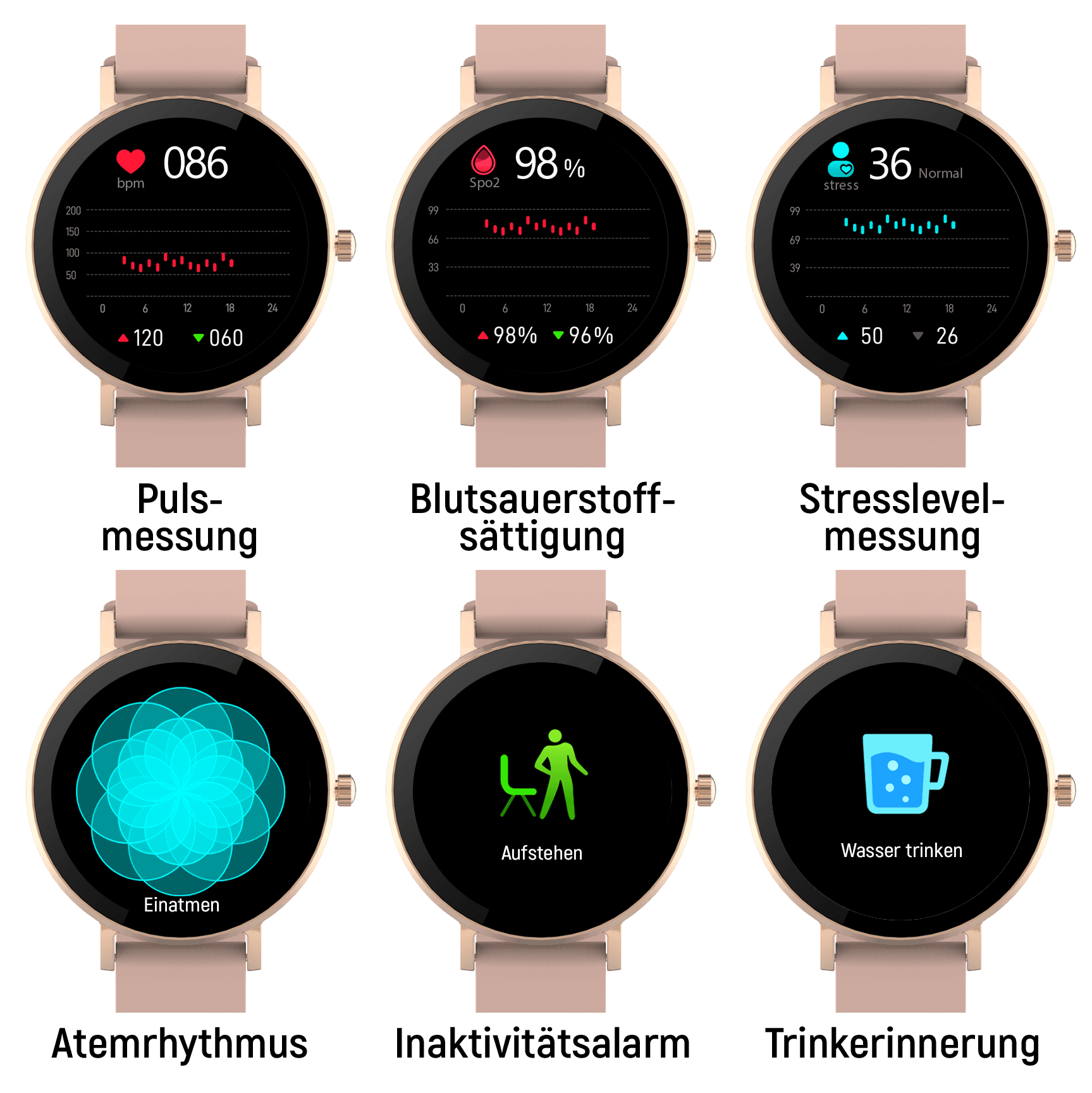 | Lieferumfang | Smartwatch, Ladekabel, 2. Bandvariante |
