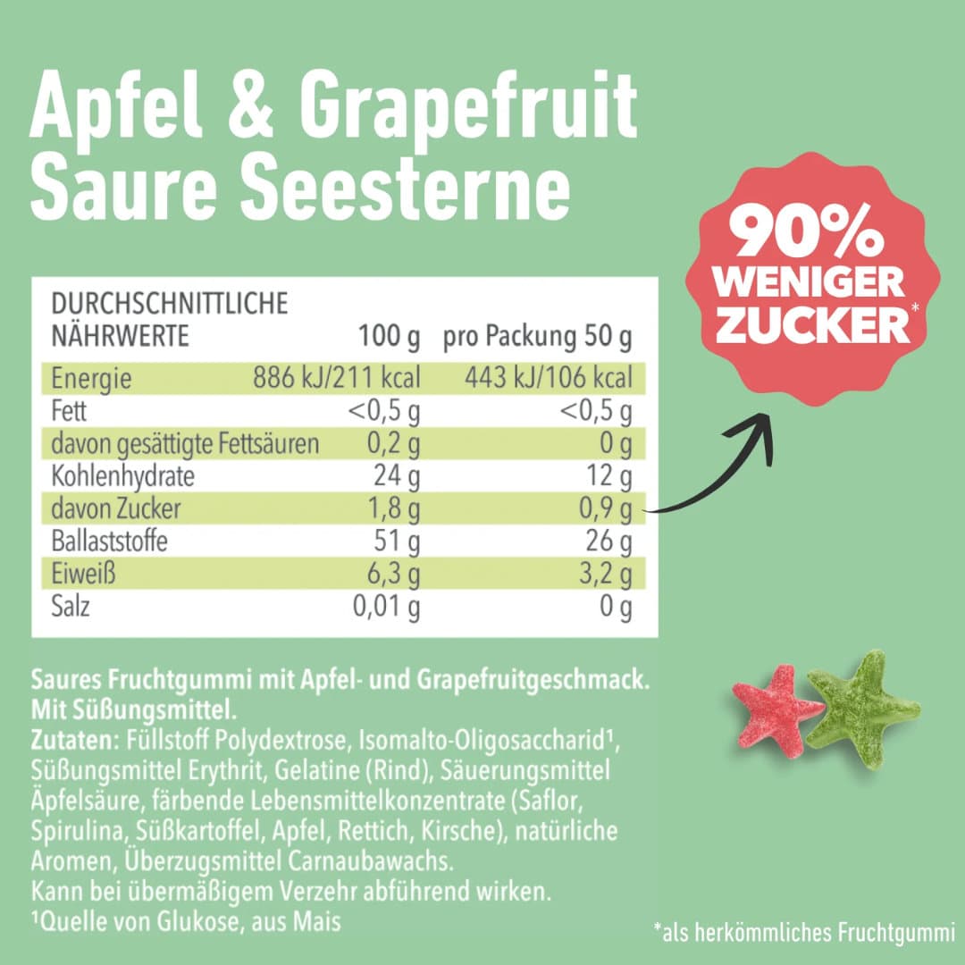 | Zutaten | Füllstoff Polydextrose, Isomalto-Oligosaccharid¹, Süßungsmittel Erythrit, Gelatine (Rind), Säuerungsmittel Äpfelsäure, färbende Lebensmittelkonzentrate (Saflor, Spirulina, Süßkartoffel, Apfel, Rettich, Kirsche), natürliche Aromen, Überzugsmittel Carnaubawachs. ¹Quelle von Glukose, aus Mais |