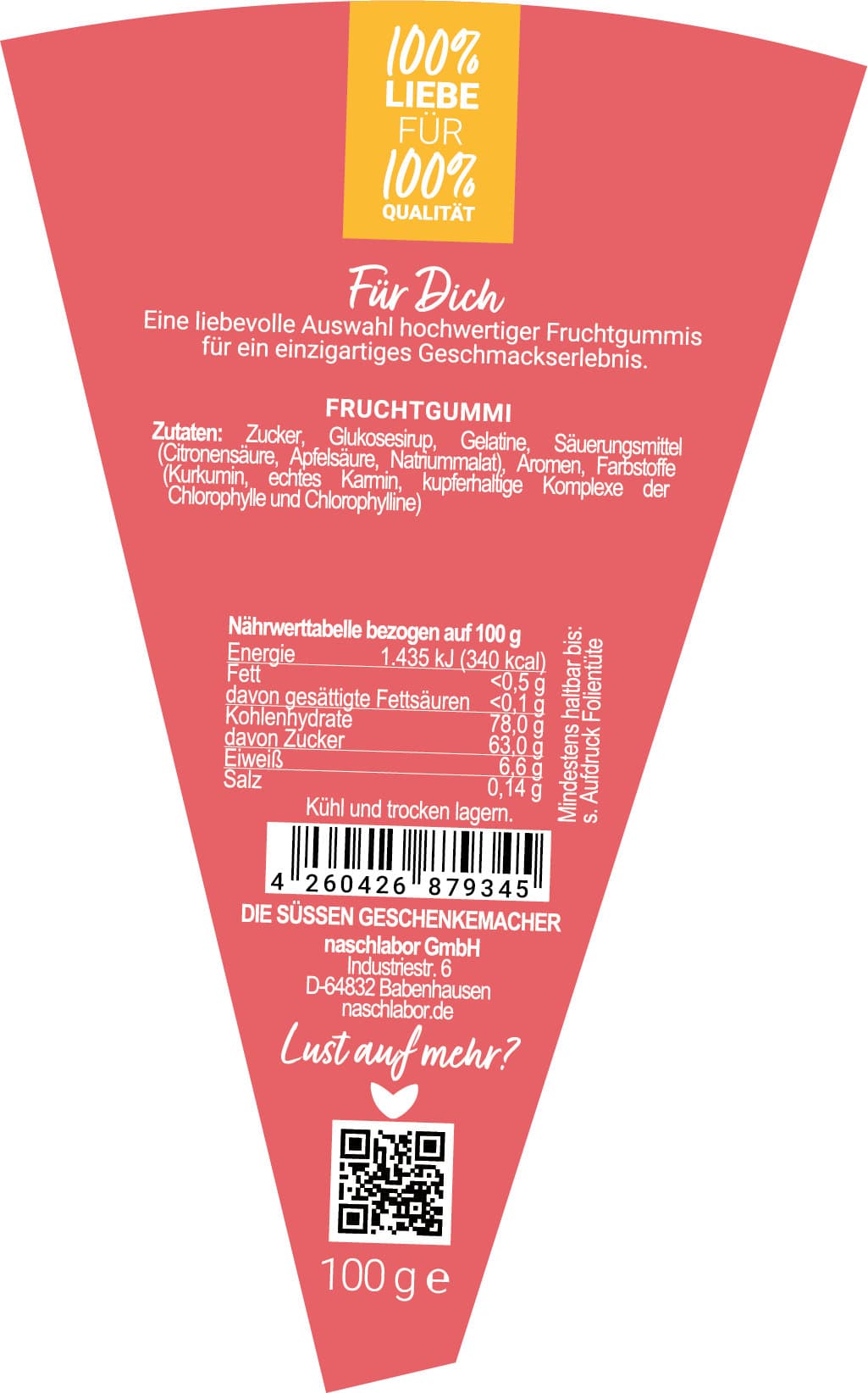 ZutatenZucker, Glukosesirup, Gelatine, Säuerungsmittel (Citronensäure, Äpfelsäure, Natriummalat), Aromen, Farbstoffe (Kurkumin, echtes Karmin, Kupferhaltige Komplexe der Chlorophylle und Chlorophylline)