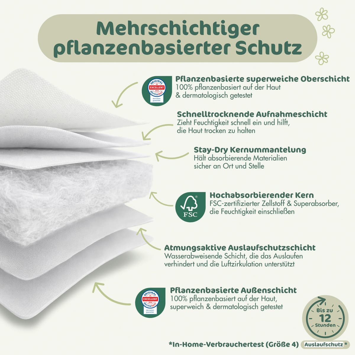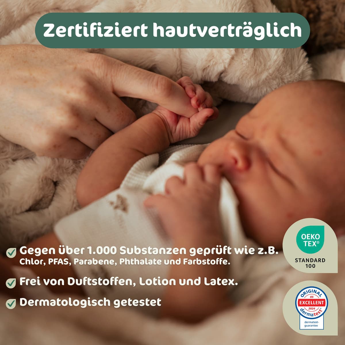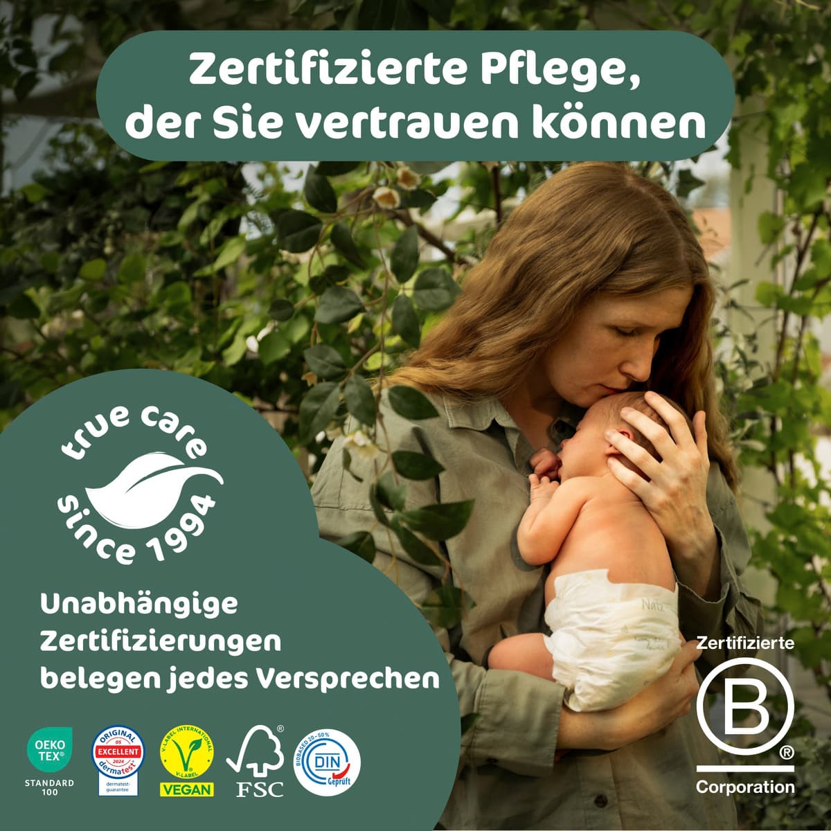 Die Windeln zeichnen sich durch ihre sorgfältig ausgewählten Materialien aus. Die Oberfläche, die die zarte Babyhaut berührt, ist vollständig biobasiert. Dank des Verzichts auf unerwünschte Chemikalien sind sie eine gute Wahl für die sensible Haut von Neugeborenen. Die Zertifizierung nach OEKO-TEX STANDARD 100 sowie das V-Label unterstreichen den bewussten Ansatz der Marke. Die atmungsaktiven Eigenschaften und der saugfähige Kern sorgen für ein trockenes und komfortables Gefühl.
