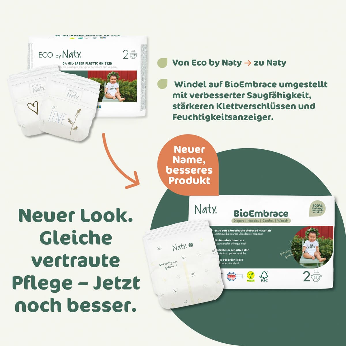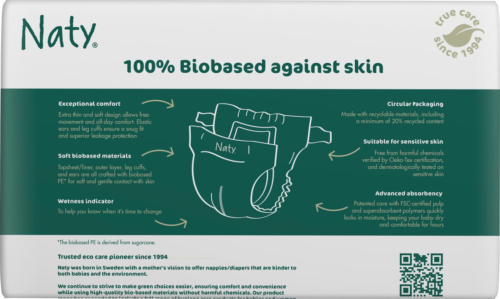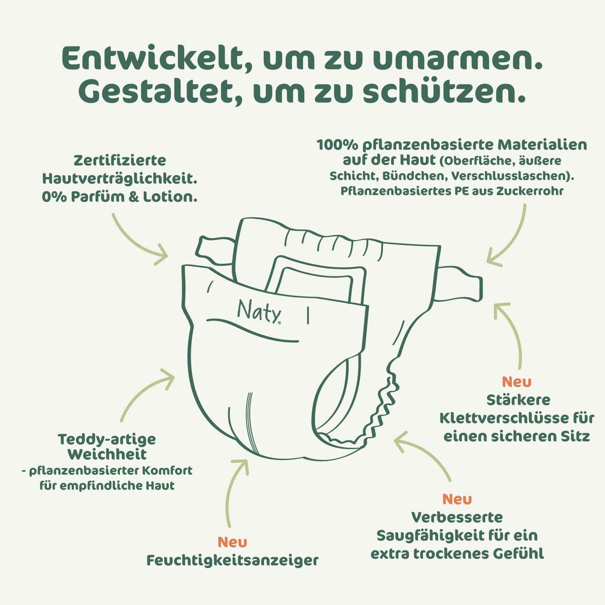 Die Naty BioEmbrace Windel besteht zu 100% aus pflanzenbasierten Materialien in Kontakt mit der empfindlichen Kinderhaut und ist gemäβ Öko-tex Standard 100 auf Schadstofffreiheit geprüft und zertifiziert. Sie verfügt über weiche, atmungsaktive, pflanzenbasierte Materialien, die maximalen Komfort für Ihr Baby gewährleisten. Der Saugkern der Windel besteht aus FSC-zertifiziertem Zellstoff, der Flüssigkeiten effektiv aufnimmt. Ein Nässeindikator zeigt Ihnen an, wann es Zeit für einen Windelwechsel ist. Windeln der Größe 2 sind für Kinder mit einem Gewicht von 3 bis 6 kg konzipiert.