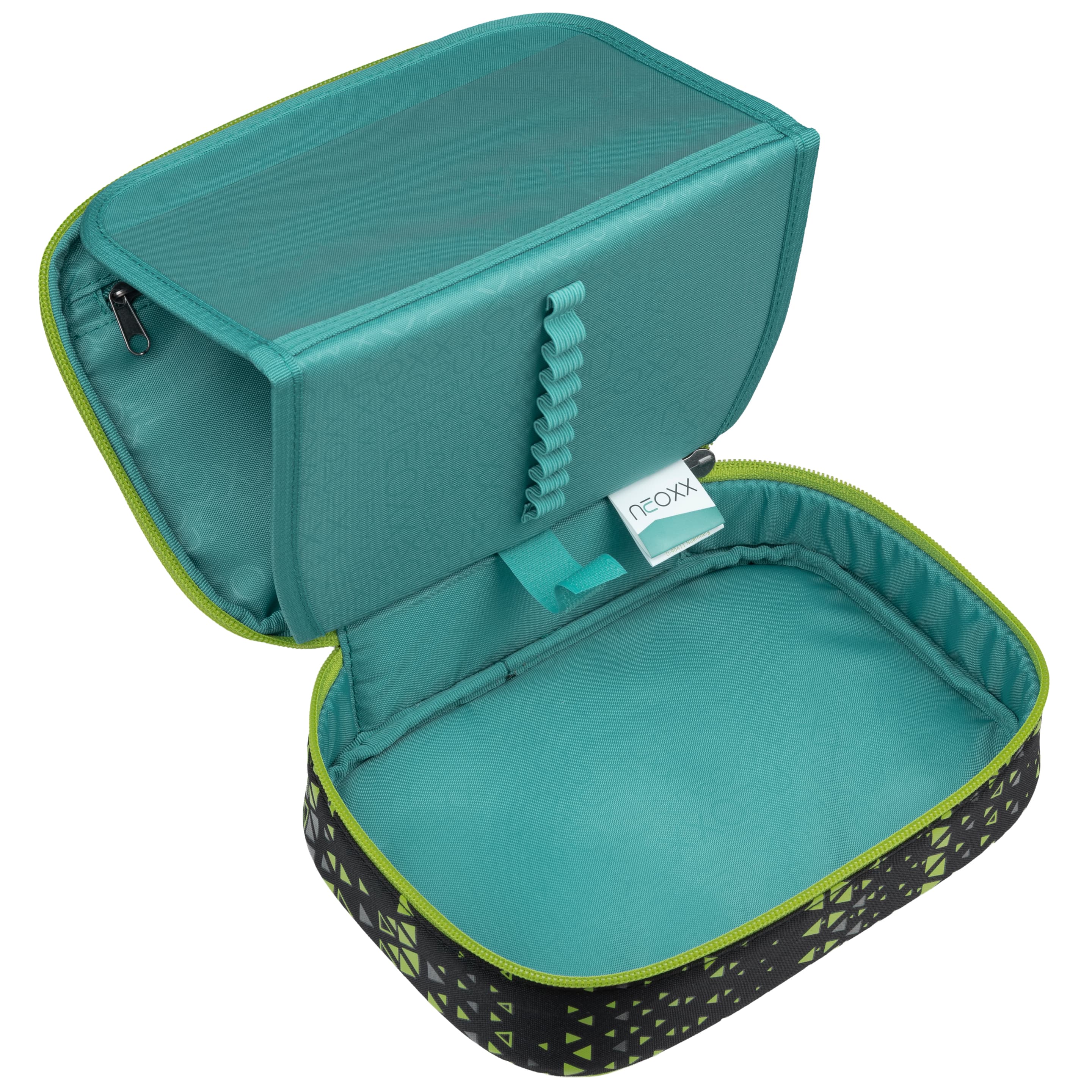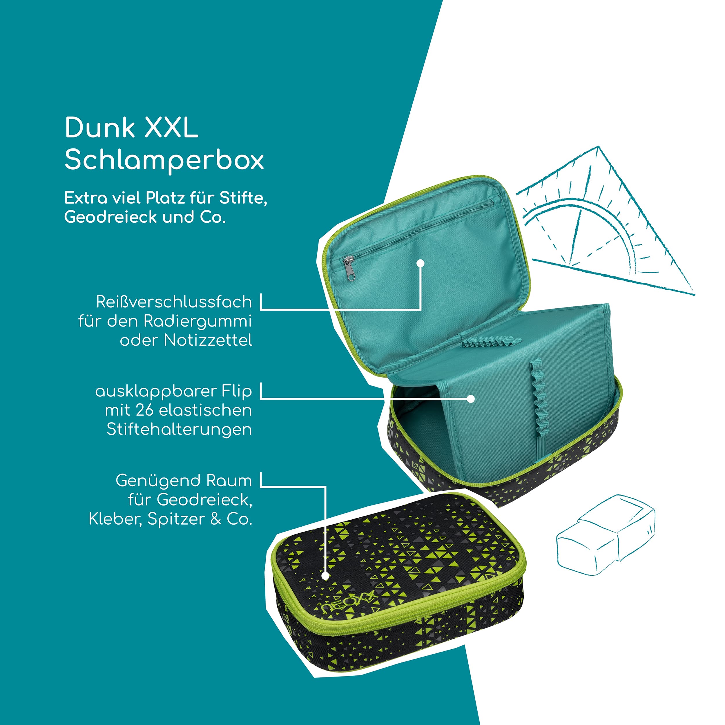Das Schlamperetui DUNK von neoxx zeichnet sich durch seine praktische Größe aus. Es bietet ausreichend Platz für Stifte und Materialien, ist jedoch kompakt genug, um in jeder Schultasche oder Rucksack verstaut zu werden. Mit einer Größe von 23,5 cm, 17 cm und 6,5 cm ist es groß genug, um alle benötigten Utensilien sicher und geordnet aufzubewahren. Die Schlamperbox von neoxx ist ideal für Schüler und Kreative, die Ordnung und praktische Aufbewahrung ihrer Stifte und Materialien lieben. Das Schlamperetui hat ein Stift-Flap, der mit 25 Stifteschlaufen ausgestattet ist. Dadurch können die Stifte sicher fixiert werden und sind jederzeit griffbereit. Das erspart lästiges Suchen in der Tasche oder im Rucksack. In einem kleinen Sichtfenster kann ein Stundenplan gesteckt werden. Zusätzlich bietet die neoxx Schlamperbox ein kleines Reißverschlussfach, in dem kleinere Dinge wie Radiergummis oder Anspitzer sicher aufbewahrt werden können. Mit dem Federmäppchen haben Schüler und Kreative alles Wichtige schnell zur Hand ohne Zeit mit dem Suchen nach Stiften oder Materialien zu verschwenden. Das gesamte Innenfutter der Schlamperbox besteht zu 100% aus recycelten PET-Flaschen. Für das Schlampermäppchen werden ca. 3 PET-Flaschen recycelt. Doch damit nicht genug: In Zusammenarbeit mit der Turtle Foundation hilft neoxx Meeresschildkröten in einer sicheren Umgebung zu schlüpfen. Somit ist das Schlampermäppchen ein Must-have für jede Schultasche.