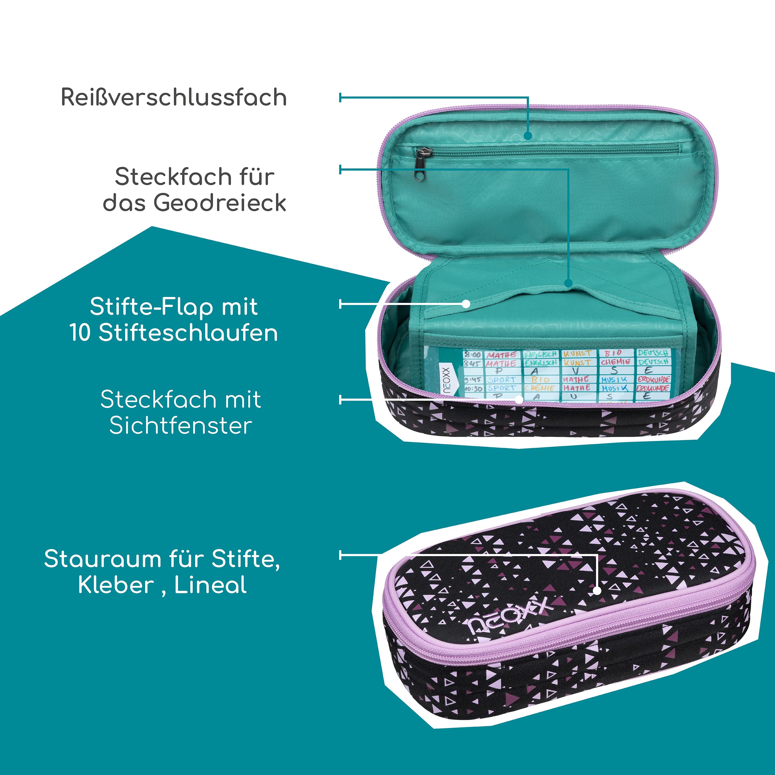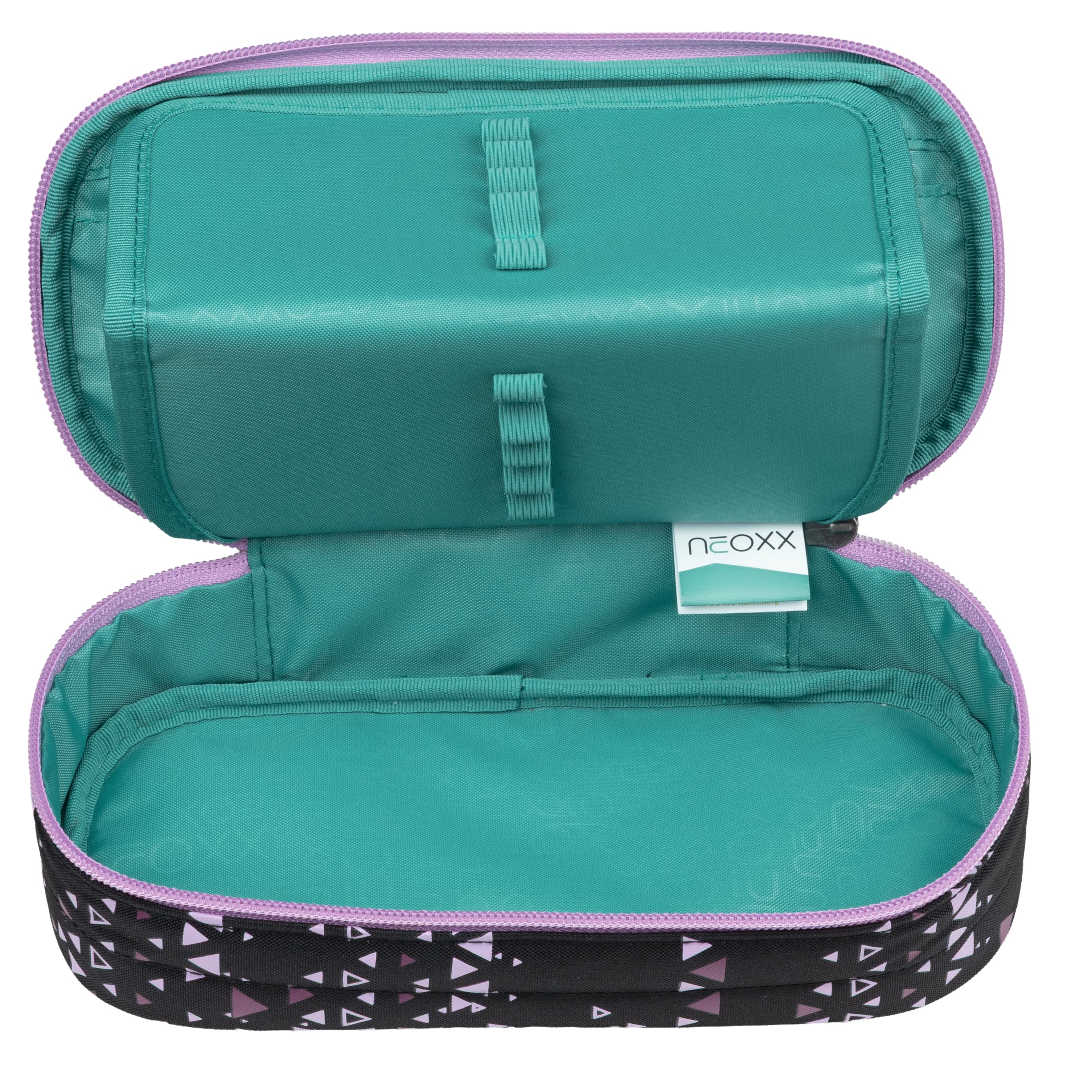 Das Schlampermäppchen Jump von neoxx ist ideal für Schüler und Kreative, die Ordnung und praktische Aufbewahrung ihrer Stifte und Materialien, sowie auch die Umwelt schätzen. Das Schlamperetui verfügt über ein spezielles Steckfach, in dem das Geodreieck sicher aufbewahrt werden kann, ohne dass es verkratzt oder beschädigt wird. Das Schlampermäppchen hat ein Stift-Flap, der mit 10 Stifteschlaufen ausgestattet ist. Dadurch können die Stifte sicher fixiert werden und sind jederzeit griffbereit. Das erspart lästiges Suchen in der Tasche oder im Rucksack. In einem kleinen Sichtfenster kann ein Stundenplan gesteckt werden. Zusätzlich bietet das neoxx Schlamperetui ein kleines Reißverschlussfach, in dem kleinere Dinge wie Radiergummis oder Anspitzer sicher aufbewahrt werden können. Mit dem Federmäppchen haben Schüler und Kreative alles Wichtige schnell zur Hand ohne Zeit mit dem Suchen nach Stiften oder Materialien zu verschwenden. Durch die umweltfreundlichen Textilien trägst auch du einen Beitrag zum Umweltschutz bei. Das gesamte Innenfutter der Schlamperbox besteht zu 100% aus recycelten PET-Flaschen. Für das Schlampermäppchen werden ca. 2 PET-Flaschen recycelt. Doch damit nicht genug: In Zusammenarbeit mit der Turtle Foundation hilft neoxx Meeresschildkröten in einer sicheren Umgebung zu schlüpfen. Somit ist das Schlampermäppchen ein Must-have für jede Schultasche.