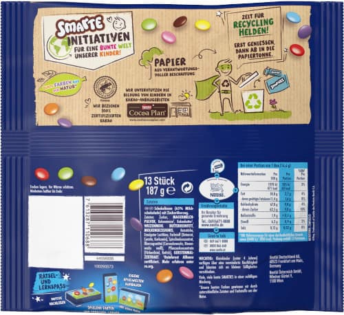 Zutaten | Zucker, MAGERMILCHPULVER, Kakaomasse*, Kakaobutter*, WEIZENMEHL, BUTTERREINFETT, MOLKENERZEUGNIS, Reisstärke, Emulgator Lecithine, Farbstoff (Betenrot, Carotin, Kurkumin), Spirulinakonzentrat, Überzugsmittel (Carnaubawachs, Bienenwachs weiß), Pflanzenkonzentrate (Färberdistel, Rettich), GERSTENMALZEXTRAKT. *Rainforest Alliance zertifiziert |