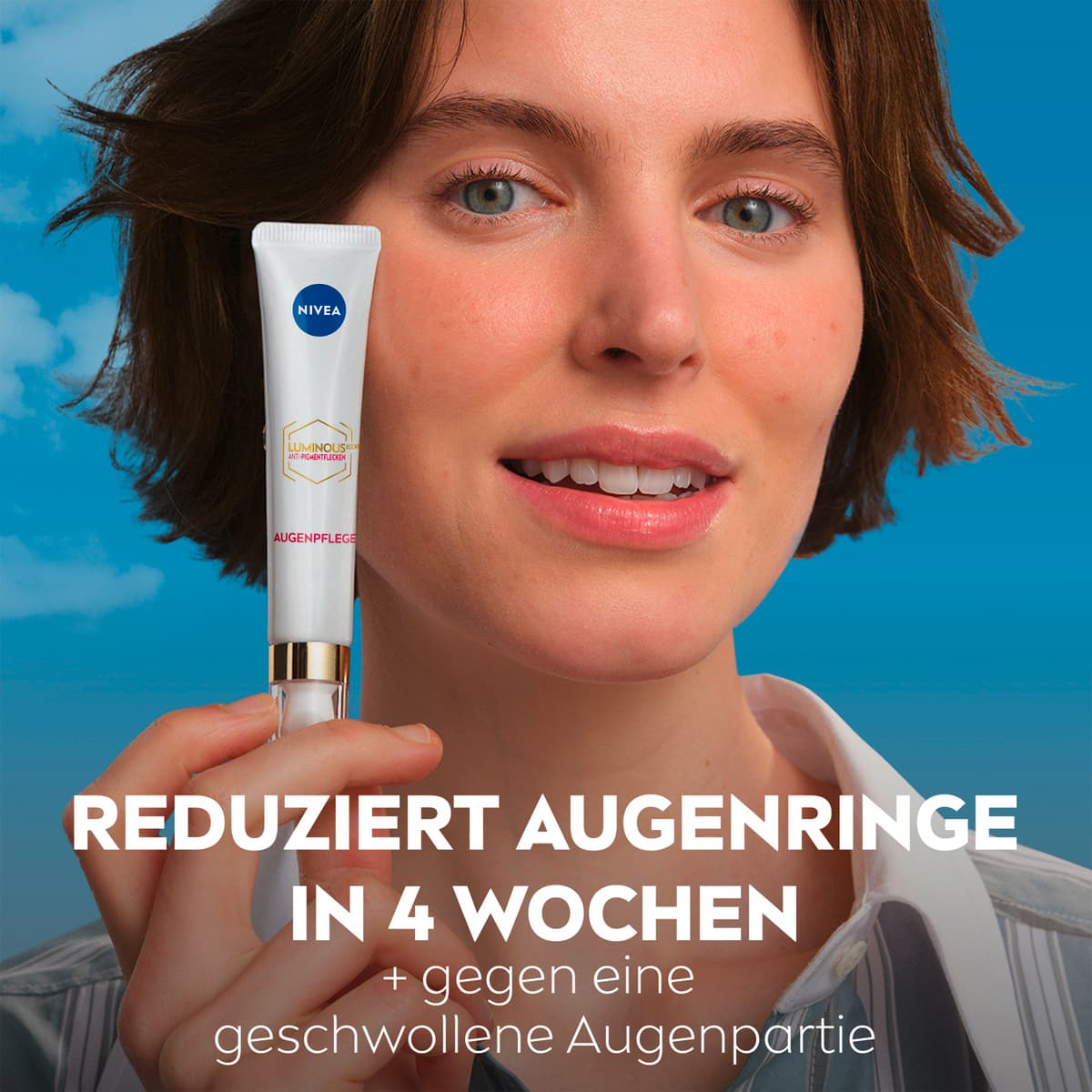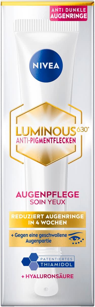 Die NIVEA Luminous 630 Anti-Pigmentflecken Augenpflege ist eine speziell auf die Bedürfnisse der Augenpartie abgestimmte Pflege. Sie wurde konzipiert, um das Erscheinungsbild von dunklen Augenringen und Schwellungen zu mildern und für ein ebenmäßigeres Hautbild zu sorgen.
