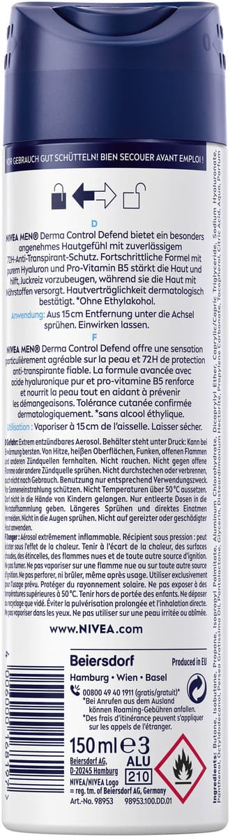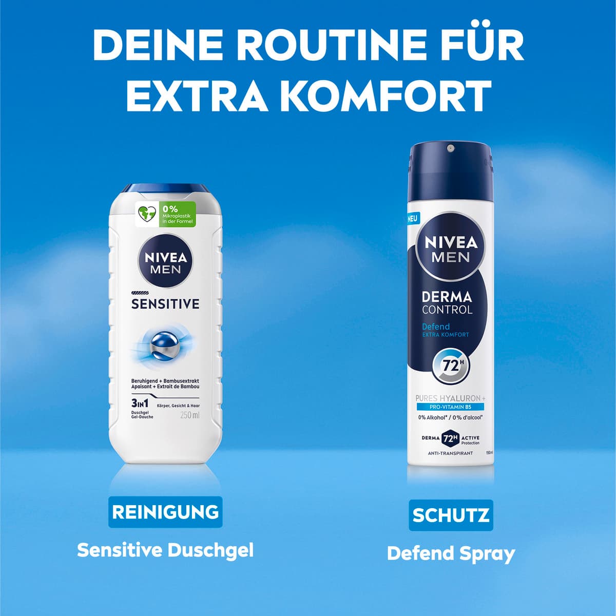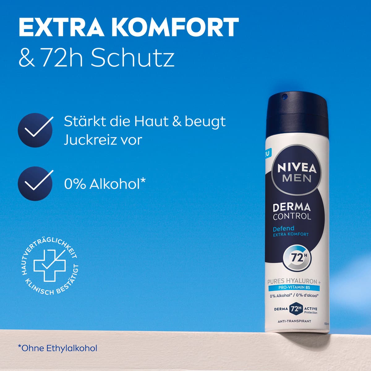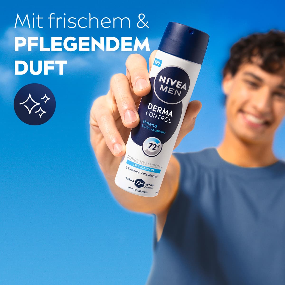 NIVEA MEN Derma Control Defend Deo Spray sorgt für ein angenehmes Hautgefühl und bietet zuverlässigen 72h Anti-Transpirant-Schutz. Die fortschrittliche Formel mit purem Hyaluron und Pro-Vitamin B5 stärkt und pflegt die Haut und lindert Juckreiz. Die Formeln sind hautverträglich, dermatologisch getestet und enthalten keinen Ethylalkohol. Das Anti-Transpirant bietet Derma 72h Aktiv-Schutz: Die Formel arbeitet mit der Haut zusammen, um eine zuverlässige und starke Wirkung gegen Schweiß und Geruch zu erzielen und gleichzeitig deine Achseln zu pflegen. NIVEA ist in mehr als 160 Ländern präsent und gehört mit mehr als 140 Jahren Erfahrung zu den größten und vertrauenswürdigsten Hautpflegemarken der Welt. Als Marktführer in der globalen Hautpflegebranche arbeiten unsere Forscher intensiv daran, hochwertige, dermatologisch geprüfte Produkte für verschiedene Hauttypen und -bedürfnisse anzubieten.