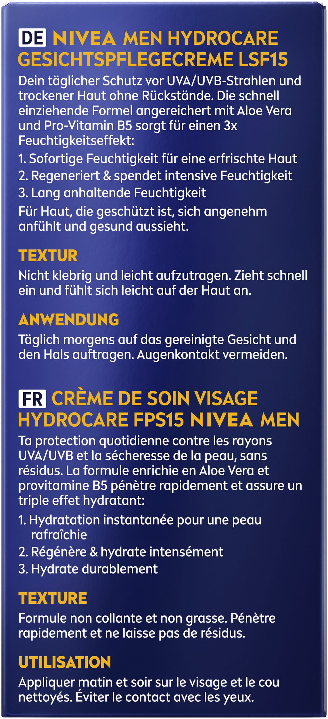 NIVEA MEN HydroCare LSF15 Feuchtigkeitscreme spendet sofortige Feuchtigkeit und regeneriert die Haut. Mit Aloe Vera und Provitamin B5 schützt sie vor äußeren Einflüssen und Trockenheit. Die nicht fettende Formel beruhigt die Haut und bietet Schutz vor schädlichen UVA- und UVB-Strahlen. Die Hautverträglichkeit ist dermatologisch getestet. Diese Creme sorgt für sofortige Feuchtigkeit und optimalen Hautkomfort.