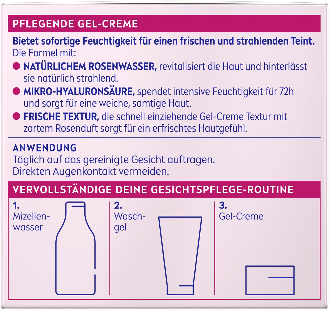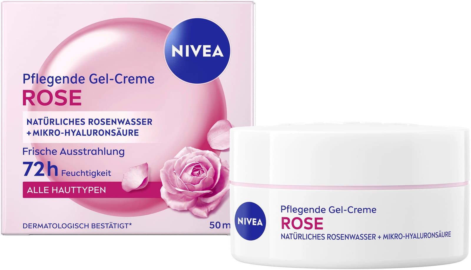 Die schnell einziehende, leichte pflegende Gel-Creme-Formel sorgt für ein angenehm frisches Hautgefühl und langanhaltende Feuchtigkeit – ganz ohne fettige Rückstände. Bietet intensive Feuchtigkeit für bis zu 72 Stunden und einen strahlenden Teint. Die Formel mit natürlichem Rosenwasser revitalisiert die Haut und hinterlässt sie natürlich strahlend. Die Mikro-Hyaluronsäure spendet sofortige Feuchtigkeit und sorgt für eine weiche und samtige Haut. Die frische Gel-Creme Textur zieht schnell ein und sorgt mir ihrem zarten Rosenduft für ein erfrischtes Hautgefühl. Einfach täglich auf das gereinigte Gesicht auftrage und dabei direkten Augenkontakt vermeiden. Die Gel-Creme ist für alle Hauttypen geeignet und ist dermatologisch bestätigt. NIVEA ist in über 160 Ländern präsent und gehört mit über 140 Jahren Erfahrung zu den größten und vertrauenswürdigsten Hautpflegemarken weltweit. Unsere Forscher entwickeln hochwertige, dermatologisch geprüfte Pflegeprodukte für unterschiedliche Hauttypen und Bedürfnisse.