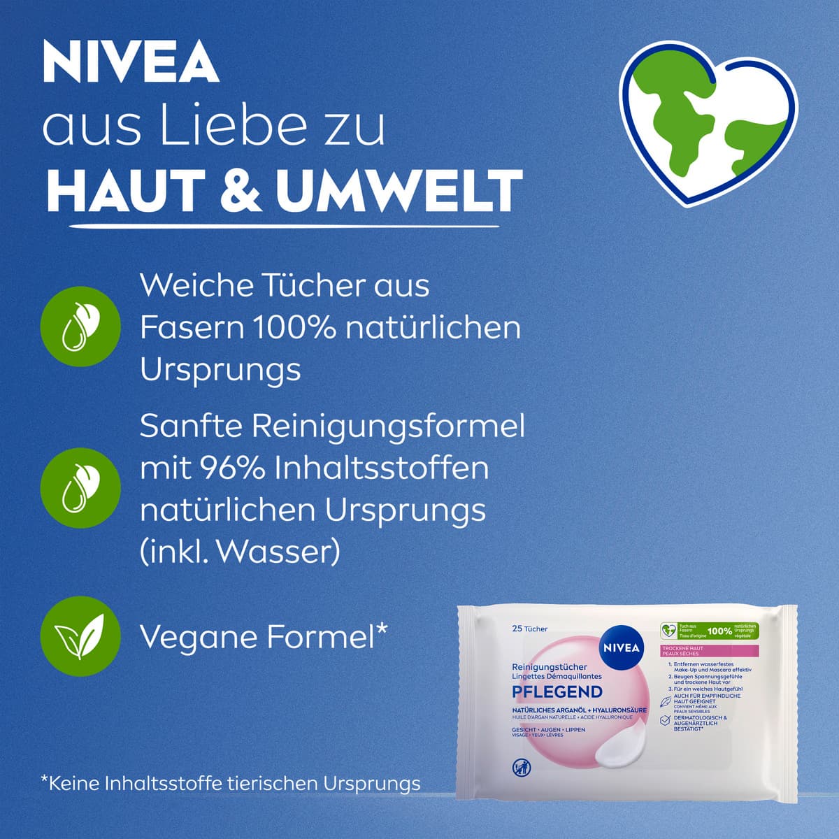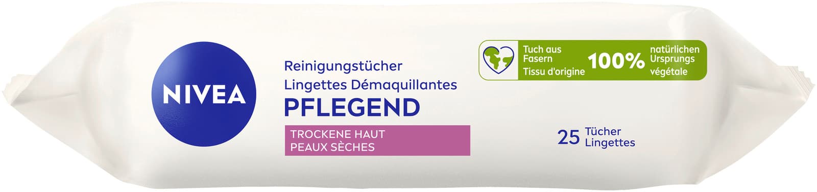 Die NIVEA Reinigungstücher Pflegend wurden speziell entwickelt, um gründlich zu reinigen und gleichzeitig sanft zu trockener und empfindlicher Haut zu sein. Angereichert mit natürlichem Arganöl und Hyaluronsäure entfernt die pflegende Formel wasserfestes Make-up, Unreinheiten, Schmutz und LSF, während das natürliche Feuchtigkeitsgleichgewicht der Haut erhalten bleibt. Die Tücher aus 100% natürlichen Fasern bieten ein sanftes und wohltuendes Reinigungserlebnis – für ein genährtes und angenehm gepflegtes Hautgefühl: NIVEA Reinigungstücher Pflegend, 25 Stück.