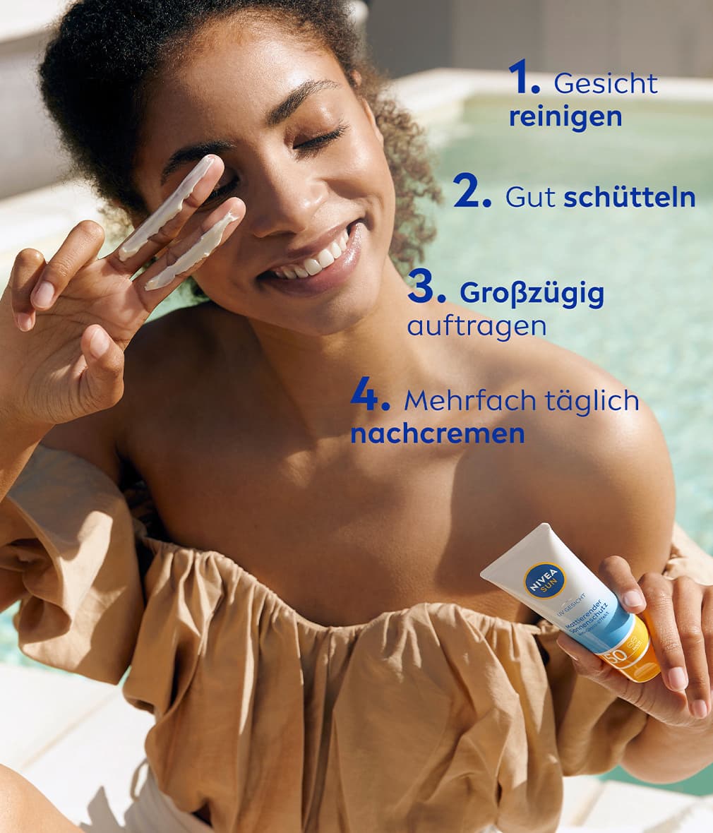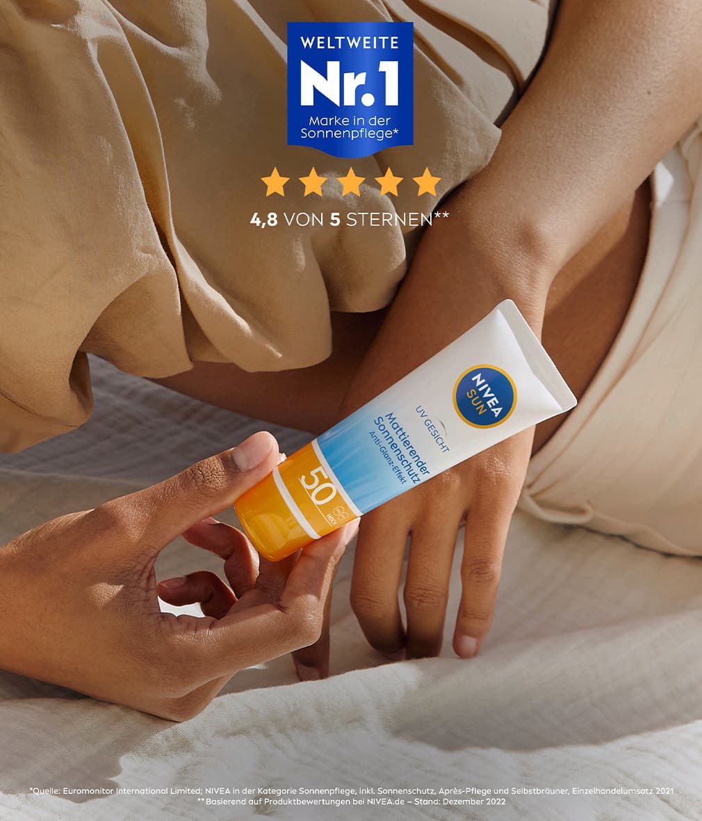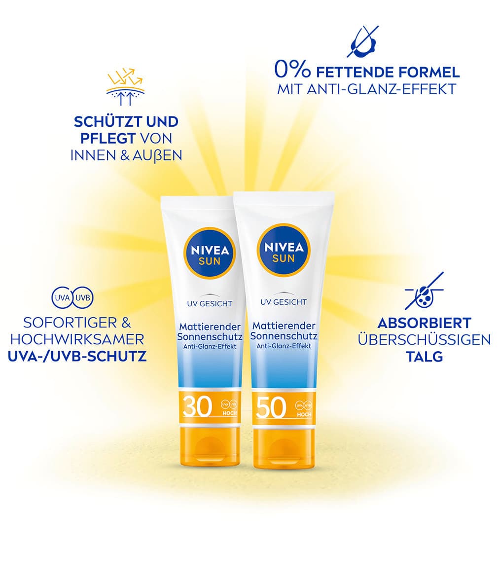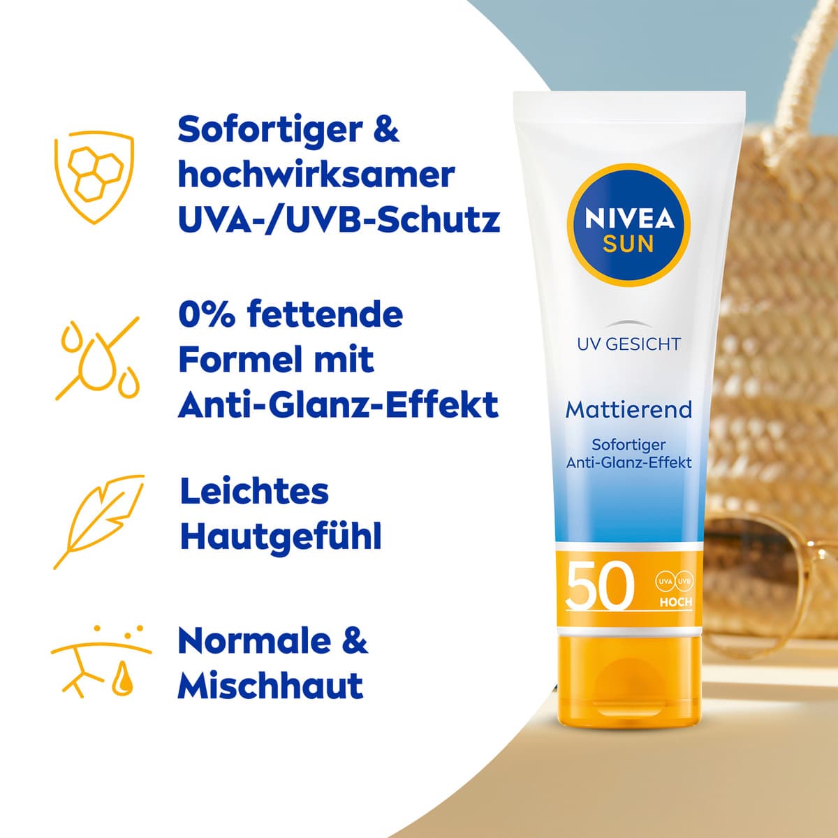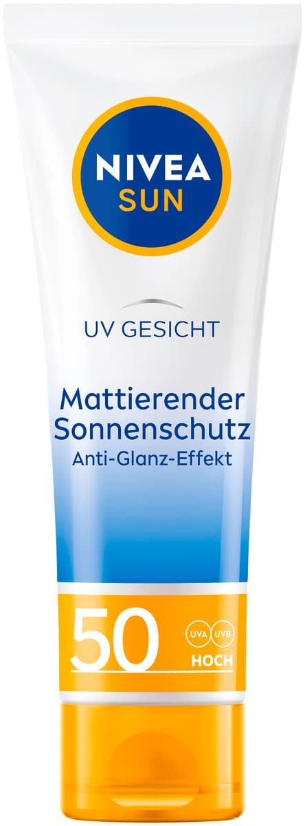 NIVEA SUN UV Face Mattierender Sonnenschutz LSF50 wurde speziell für empfindliche Gesichtshaut entwickelt. Dieser Sonnenschutz schützt gesunde Haut von außen vor UVA-/UVB-Strahlen und den Auswirkungen von hochenergetischem sichtbarem Licht, wie vorzeitiger Hautalterung. Er schützt die Haut auch von innen dank eines starken natürlichen Antioxidans, das die eigenen Abwehrmechanismen der Haut aktiviert. Die leichte und nicht fettende Formel mit 0 % klebrigem Gefühl sorgt für einen sofortigen und langanhaltenden mattierenden Effekt. Entwickelt für normale und Mischhauttypen. Ideal für die tägliche Anwendung, die Formel ist ophthalmologisch getestet (also augenfreundlich) und die Hautverträglichkeit ist dermatologisch geprüft. NIVEA SUN hat sich zum Ziel gesetzt, die Auswirkungen auf die Umwelt zu minimieren. Die Formel ist zu 66 % biologisch abbaubar und respektiert den Ozean, da sie frei von den UV-Filtern Octinoxat, Oxybenzon und Octocrylen sowie frei von Mikroplastik ist. Die Tube und der Deckel bestehen zu 50 % aus recyceltem Kunststoff. Der Karton der Faltbox ist sorgfältig ausgewählt und FSC-zertifiziert. Schutz für alle mit NIVEA SUN für Erwachsene und Kinder.