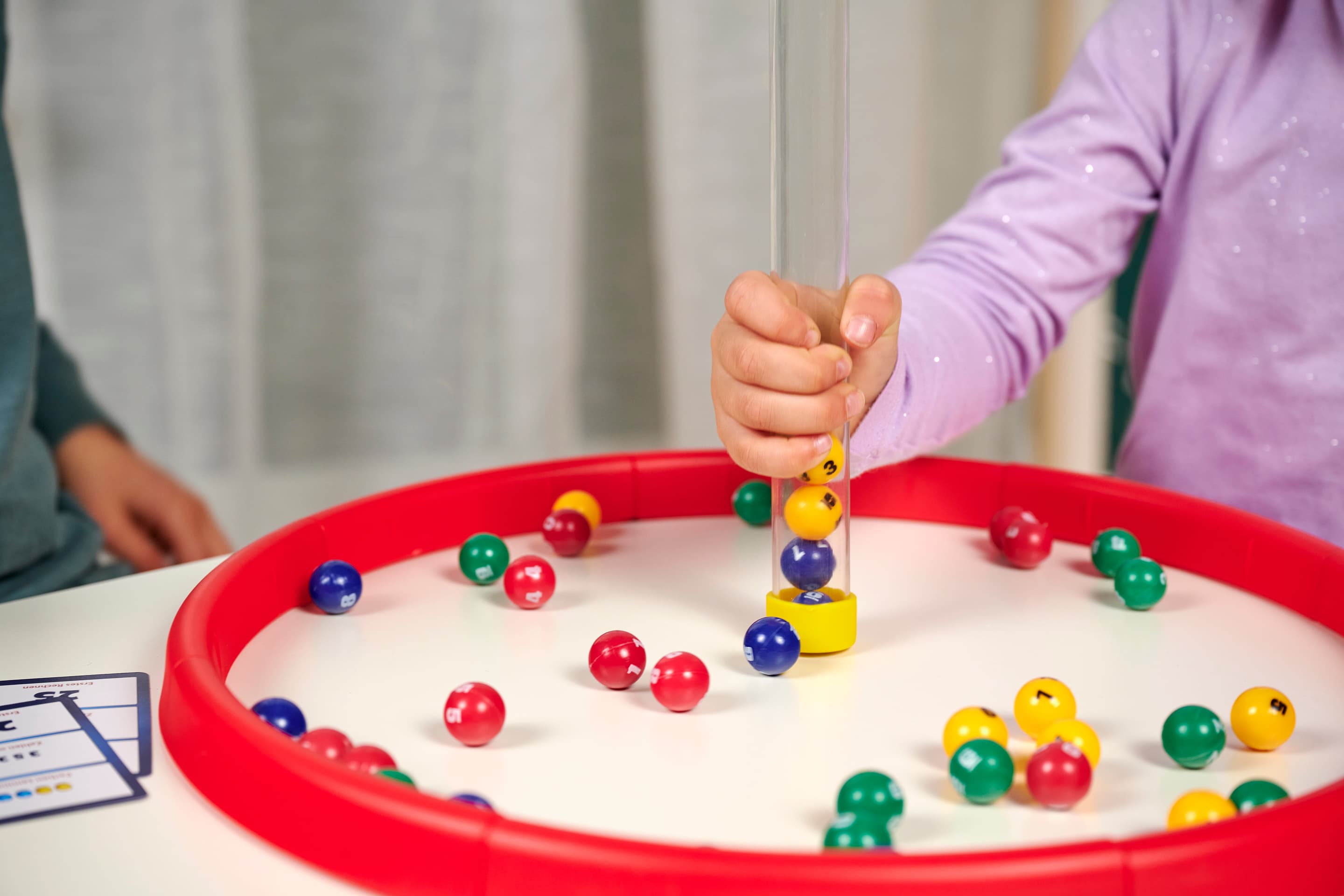 Jede Menge Action gibt es bei dem Spiel"Kugelblitz"! Beim rasanten Kugel-Wettbewerb versuchen die Spieler mit einer Röhre Murmeln in einer bestimmten Reihenfolge einzusammeln. Die Kugeln haben verschieden Farben und Nummern aufgedruckt, Spielkarten geben die Aufgabe vor. Drei verschiedene Schwierigkeitsgrade bringen Klein und Groß bei diesem Spiel mit Lern-Effekt mächtig ins Schwitzen! Bei Stufe eins gilt es die bunten Kugeln in der richtigen Farb-Reihenfolge aufzusammeln, bei der zweiten Schwierigkeitsstufe sind die auf den Murmeln aufgedruckten Zahlen ausschlaggebend. Richtig anspruchsvoll wird es, wenn die Spielkarten Rechenaufgaben zeigen und die Ergebnisse dann mit den Murmeln aufgesammelt werden müssen.Für 2-4 Spieler ab 4 Jahren geeignet.