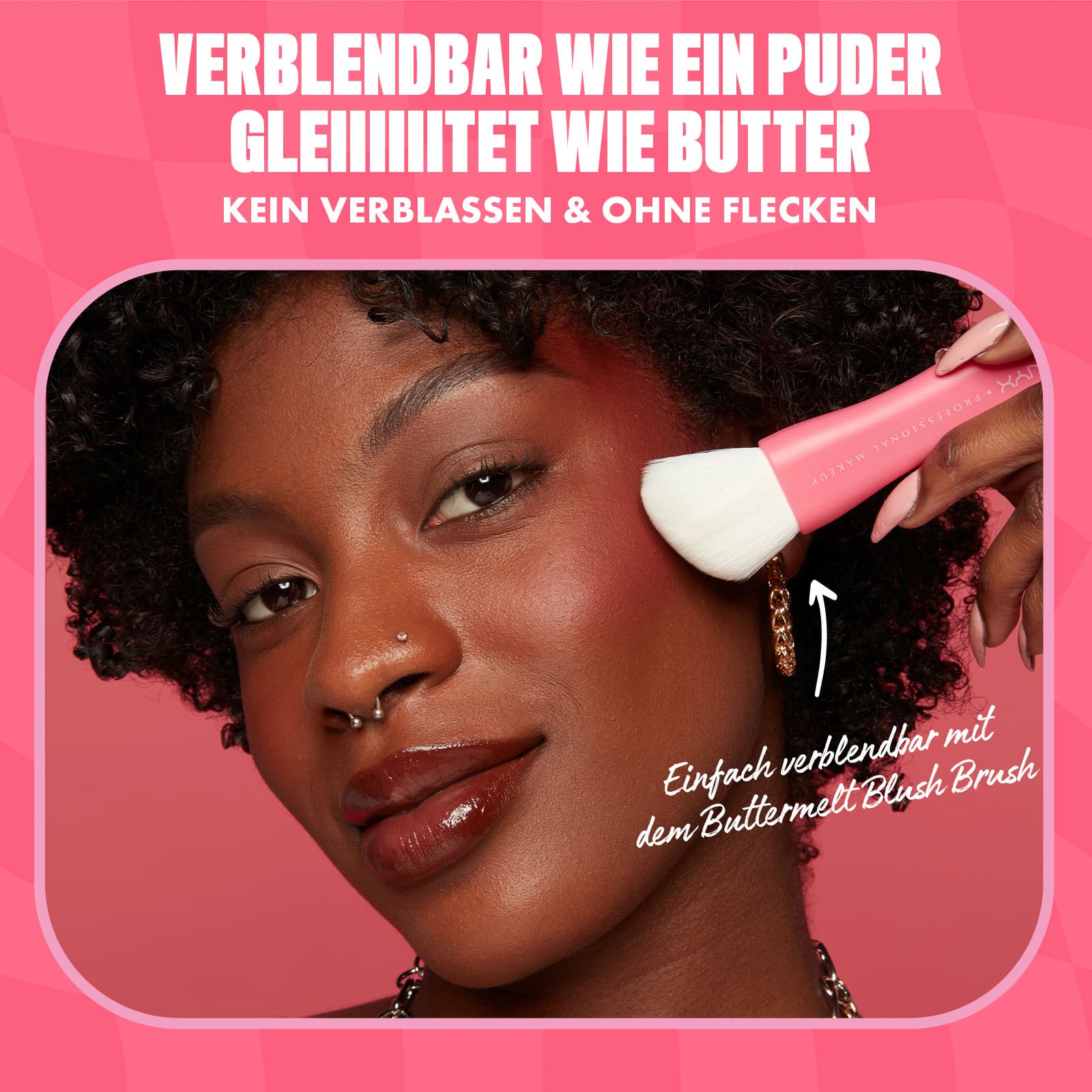 | Anwendungshinweis | Für einen frischen Look den Buttermelt Blush von NYX Professional Make up mit einem abgeschrägten Pinsel aufnehmen und überschüssiges Produkt leicht abklopfen. Nun den Blush oberhalb des Wangenknochens auftragen und gleichmäßig verblenden. Bei Bedarf den Vorgang wiederholen, um die gewünschte Farbintensität zu erreichen. Darüber hinaus kann der Blush auch auf den Augenlidern aufgetragen werden. |