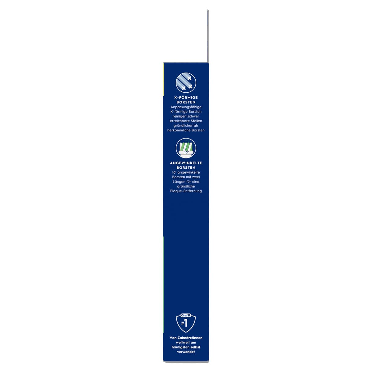 Klinisch bestätigt: Entfernt 10x besser Plaque* als Bürstenköpfe der meistverkauften Eigenmarke in Deutschland** (*12 Wochen durchschnittl. Plaqueentfernung, **Nielsen Handelspanel L12M). Die Original-Bürstenköpfe von Oral-B wurden mit neuen X-förmigen Borsten entwickelt, die nun auch die Stellen reinigen, die normale Borsten nicht erreichen können. Die grünen Indikator-Borsten färben sich mit der Zeit je nach individueller Nutzung gelb und zeigen damit den optimalen Zeitpunkt zum Wechseln der Aufsteckbürste an - für 100% Putzkraft. Garantierte Passform mit allen wiederaufladbaren Zahnbürsten von Oral-B, außer Pulsonic und iO.