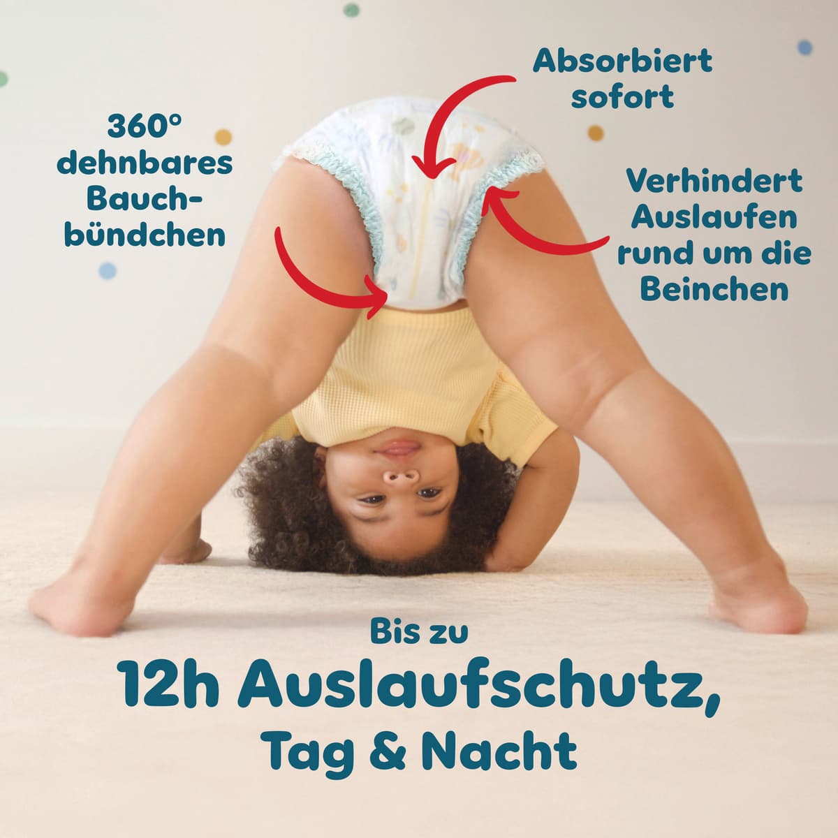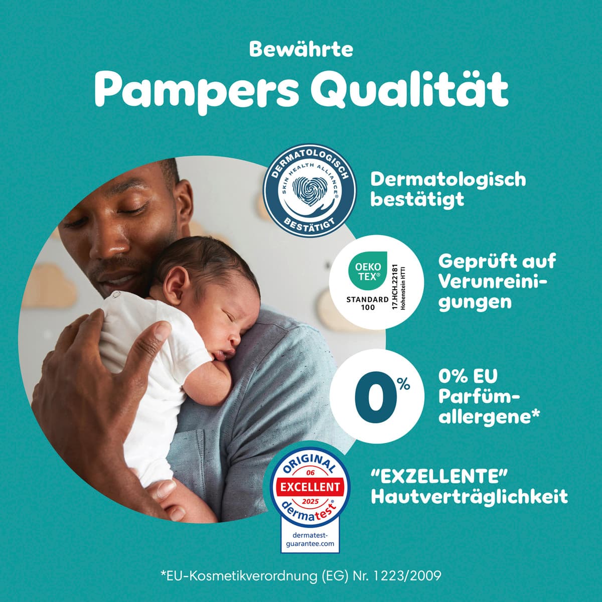 Wenn dein Baby aktiver wird, braucht es eine Pants, die bequem sitzt, zuverlässigen Schutz bietet und jede Bewegung mitmacht. Mit ihrem revolutionären Stop & Schutz System bieten Pampers Baby-Dry Pants überlegenen Rundum-Auslaufschutz, egal in welcher Position sich dein Baby befindet - Tag und Nacht! Das Stop & Schutz System der Pampers Baby-Dry Pants umfasst: Anti-Auslaufbündchen an den Beinchen, 360° Passform am Bauch, die sich den Bewegungen deines aktiven Babys anpasst, und einen super saugfähigen Kern für bis zu 12 Stunden Schutz. Wie all unsere Pants lassen sich auch Baby-Dry Pants leicht wechseln, selbst wenn dein Baby sich bewegt: zum Anziehen Pants einfach hochziehen, zum Ausziehen die Seitenbündchen aufreißen, einrollen und dank Klebestreifen einfach entsorgen. Genau wie für dich steht die Sicherheit deines Babys auch für Pampers an erster Stelle: Pampers Baby-Dry Pants sind dermatologisch getestet, enthalten 0% EU-Parfümallergene (keine absichtlich hinzugefügten EU-Parfümallergene gemäß der EU-Kosmetikverordnung (EG) Nr. 1223/2009) und sind OEKO-TEX STANDARD 100 getestet und zertifiziert. Möchtest du mehr über die Bestandteile unserer Produkte erfahren? Besuche uns auf pampers.de, pampers.at und pampers.ch.