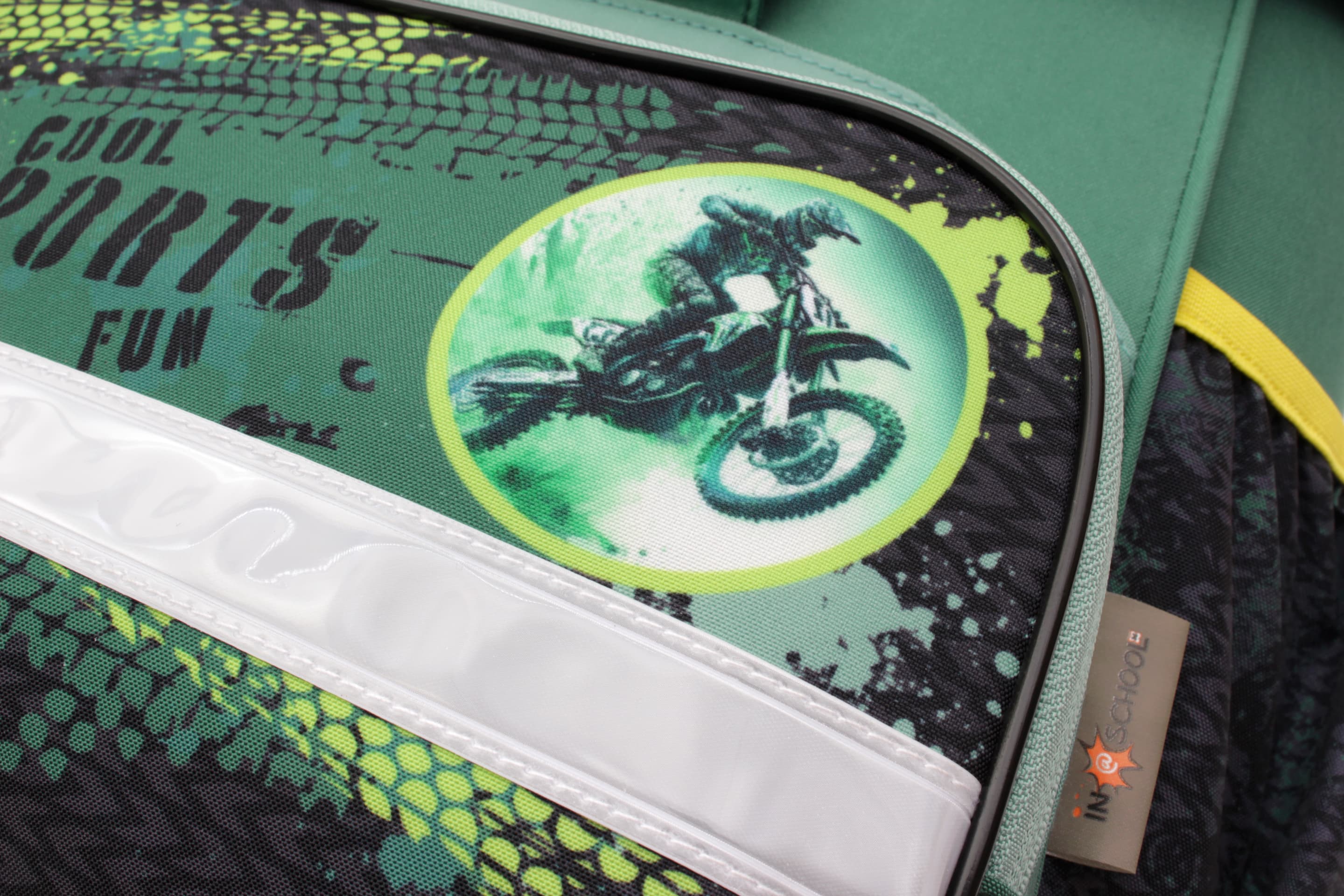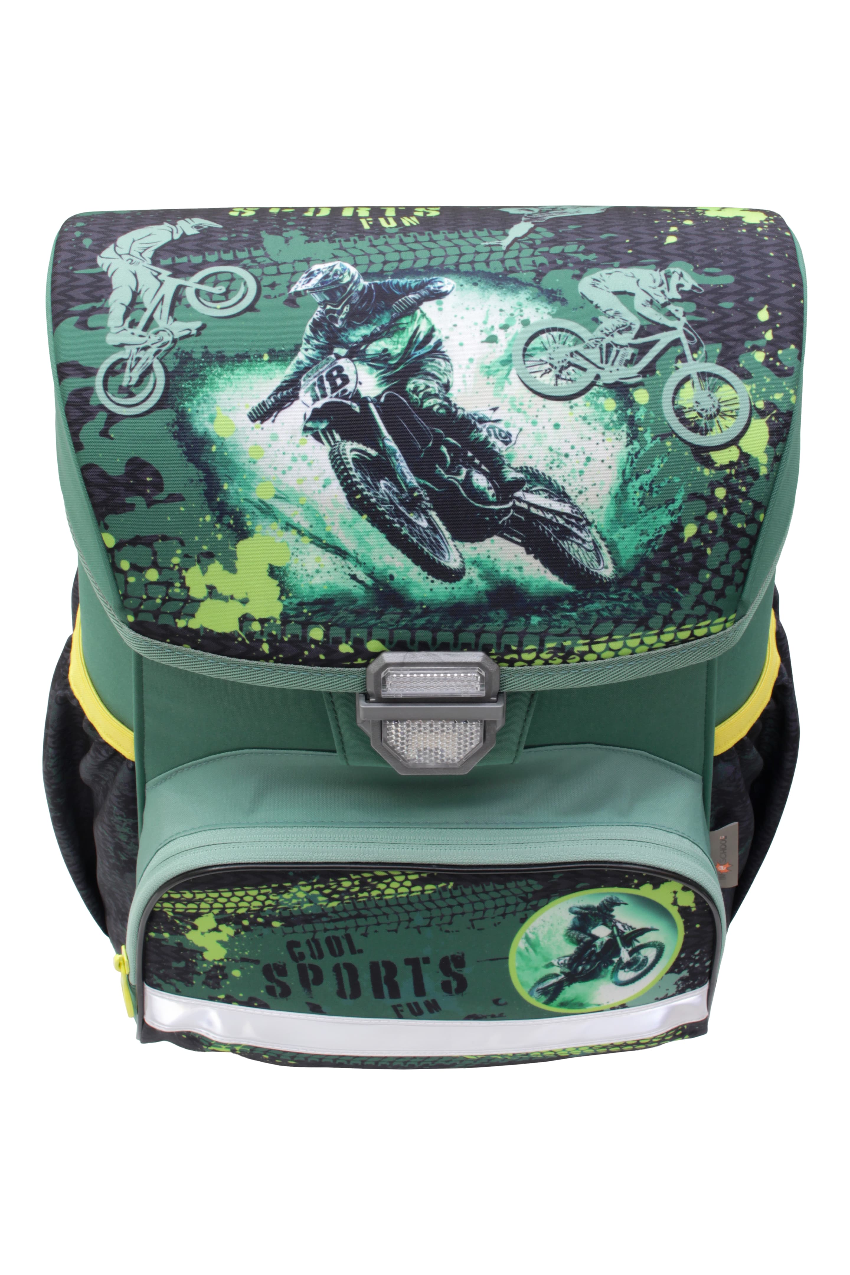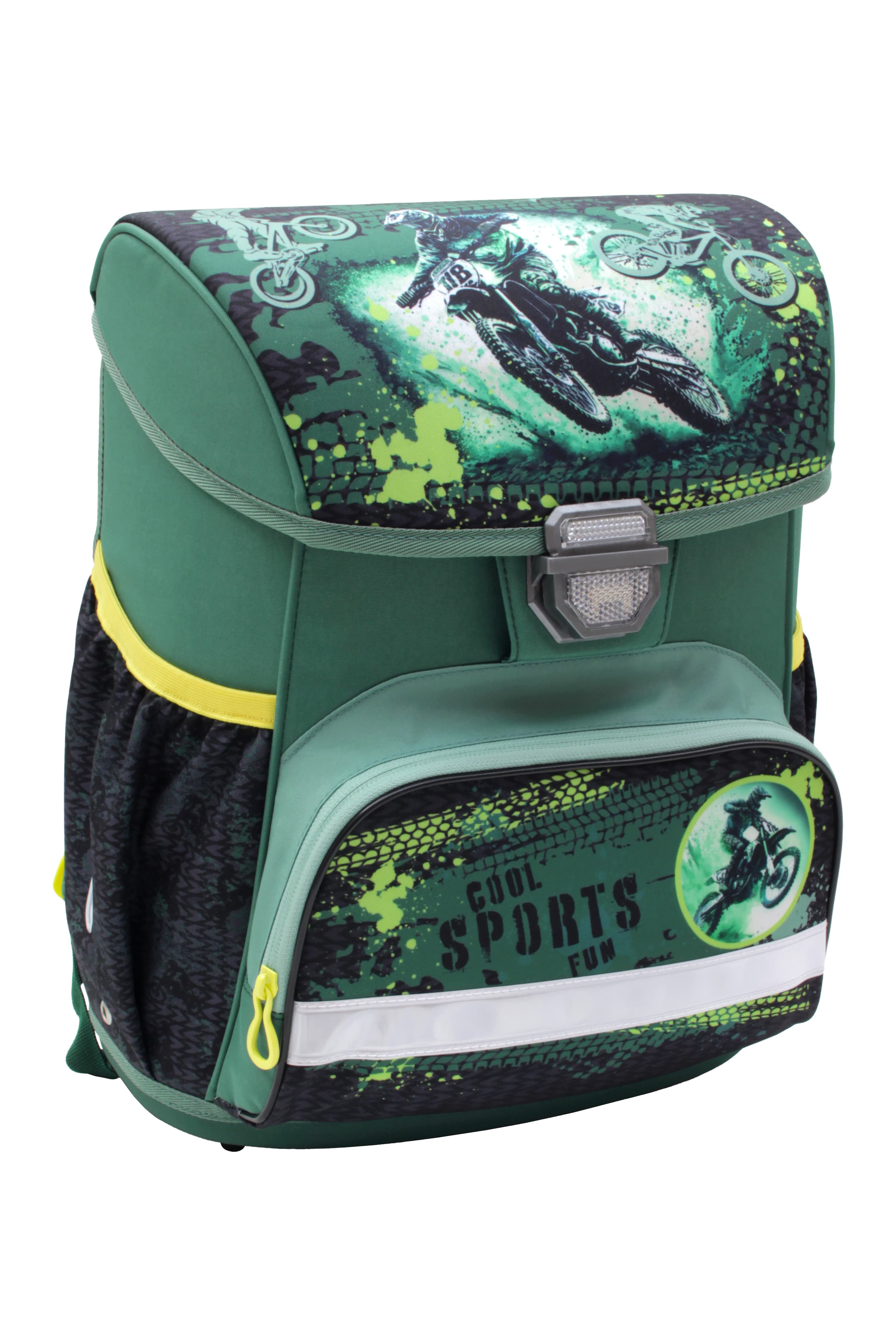 Sportliches Schulranzen-Set mit actionreichem Motorrad-Design. Der ergonomische Schulranzen bietet viel Stauraum und angenehmen Tragekomfort. Reflektierende Elemente sorgen für mehr Sicherheit im Straßenverkehr.